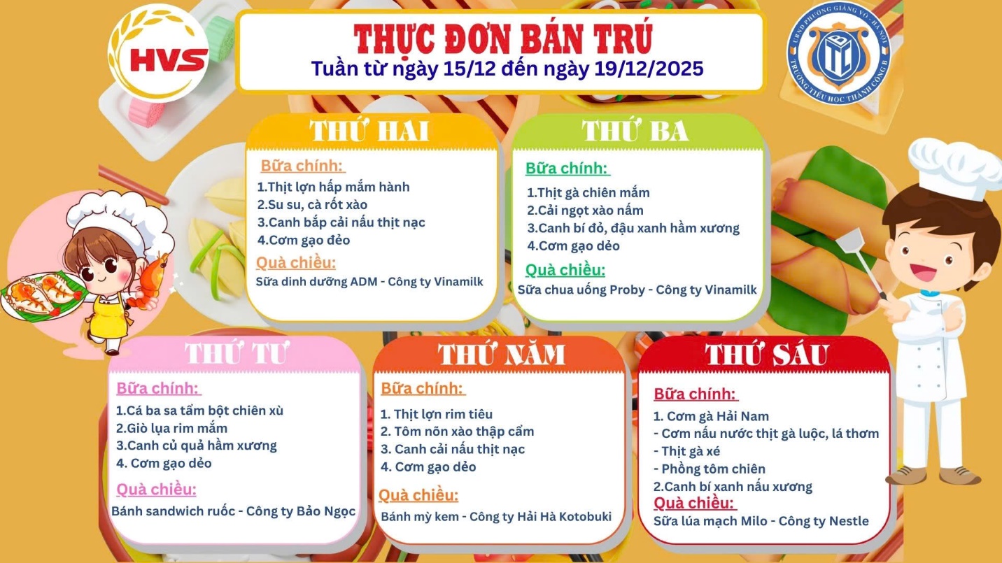 Kính gửi: Quý Phụ huynh trường Tiểu học Thành Công B. Thực đơn bán trú từ ngày 15/12 đến ngày 19/12. Trân trọng!