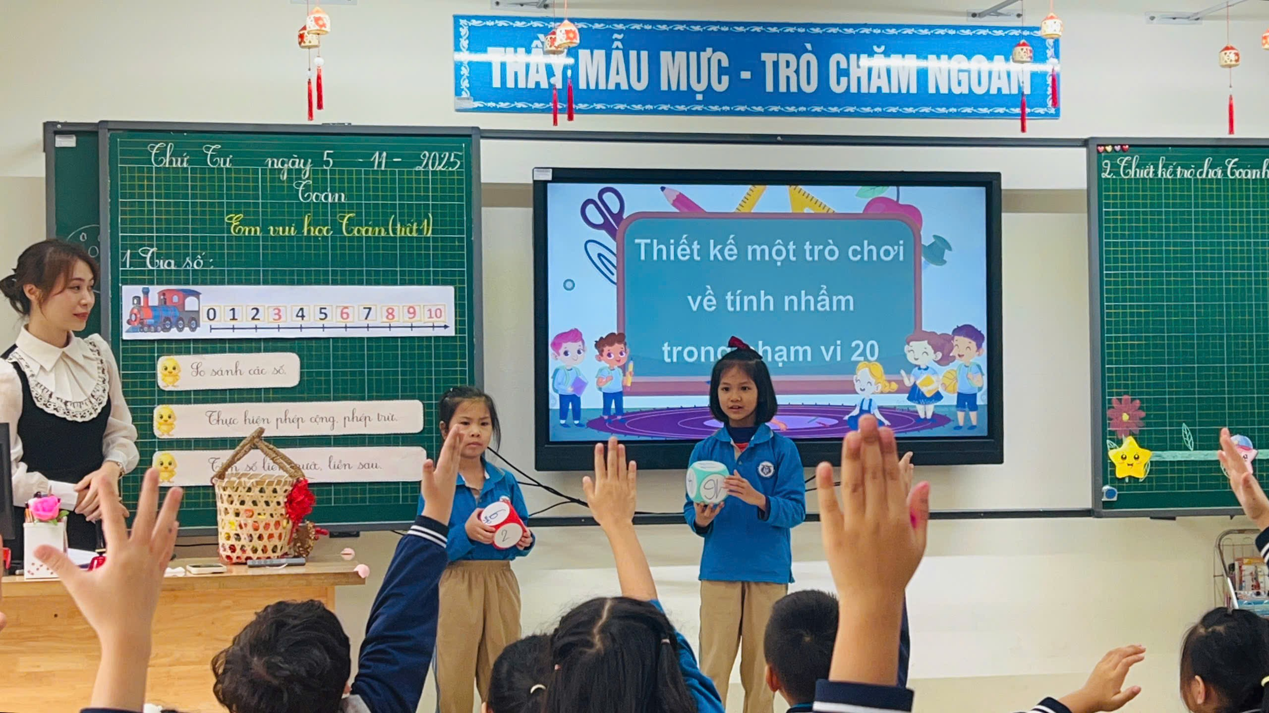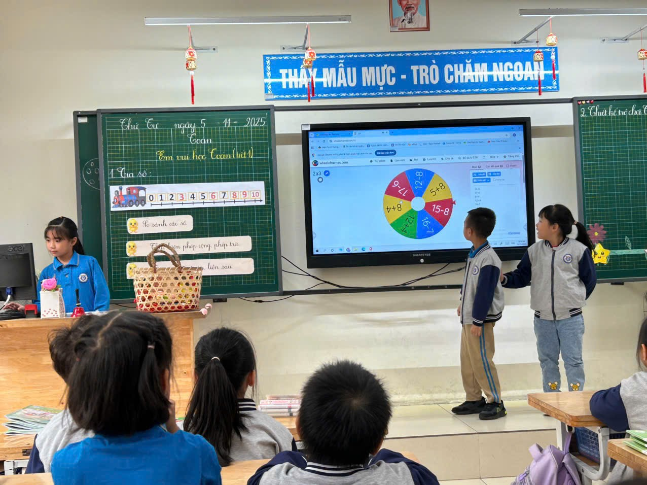 Ngay từ khi tiết học bắt đầu, cô Ngọc đã khơi gợi niềm hứng khởi bằng phần khởi động vui nhộn cùng bài múa hát và trò chơi thú vị cùng bạn Gà con. Sau đó, cô dẫn dắt học sinh ôn lại kiến thức về tia số và các phép tính trong phạm vi 20 qua những trò chơi Toán học thú vị. Các em được trải nghiệm thiết kế và chơi vòng quay may mắn trên Wheelofnames, hay cùng chờ đón ai sẽ là “ngôi sao may mắn” trên Class Dojo – nơi mỗi câu trả lời đúng đều mang về những điểm thưởng và niềm vui nho nhỏ, khiến không khí lớp học thêm sôi nổi, gắn kết.