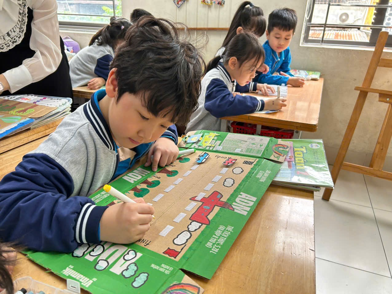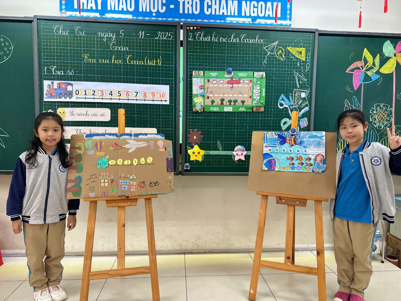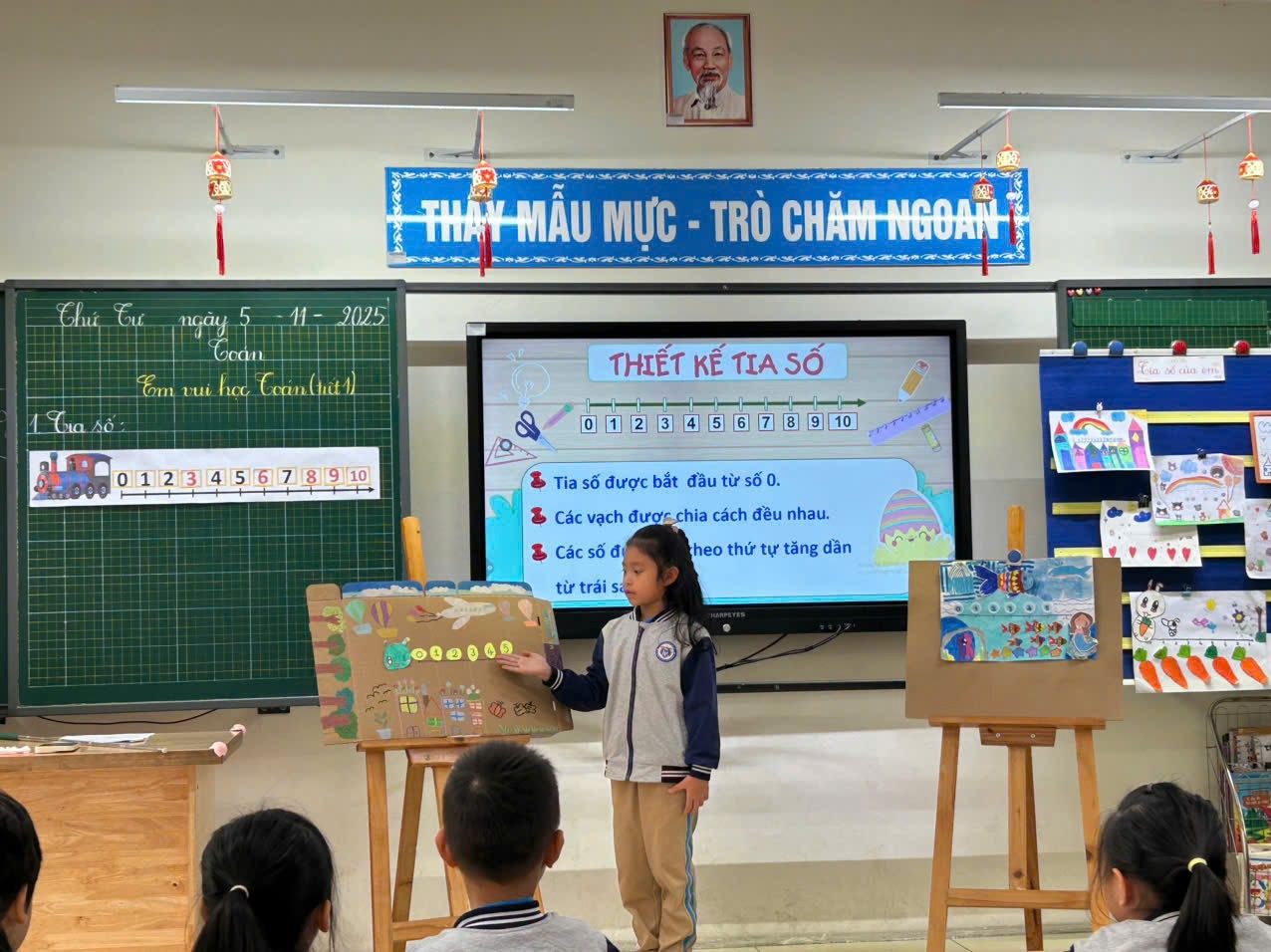 Không chỉ dừng lại ở kiến thức, cô Ngọc còn khéo léo lồng ghép giáo dục STEM, công dân số và bảo vệ môi trường trong từng hoạt động. Học sinh được tham gia thiết kế tia số mang phong cách cá nhân của riêng các em. Các bạn nhỏ đã biết tận dụng những nguyên liệu sẵn có, có thể tái chế như bìa, túi nilon đã qua sử dụng, vỏ nắp chai nhựa để tạo nên sản phẩm. Từ đó, các em hiểu rằng Toán học không chỉ giúp ta tính toán chính xác, mà còn có thể góp phần làm cho thế giới sạch đẹp hơn.