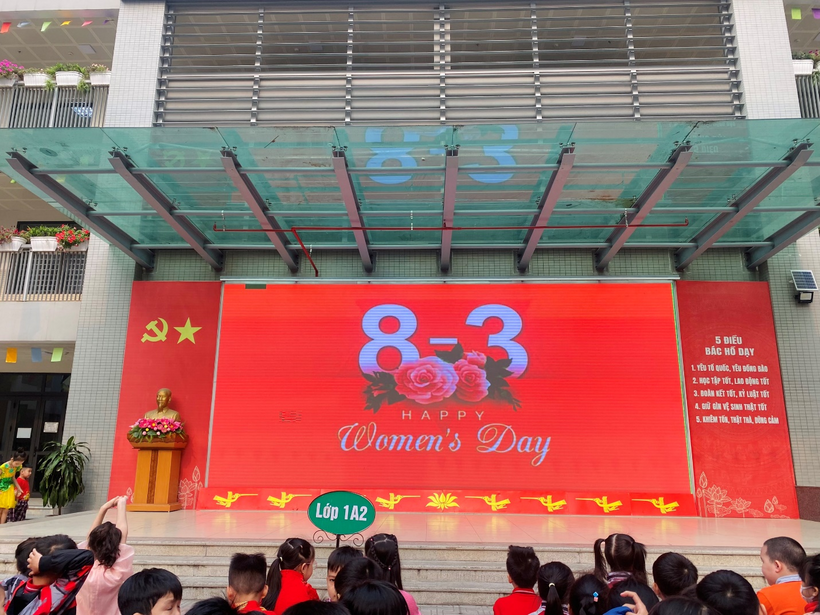 Tiếp đó, học sinh toàn trường được xem đoạn phim tư liệu ôn lại lịch sử của Ngày Quốc tế Phụ nữ 8/3, ngày phụ nữ trên toàn thế giới được cả nhân loại tôn vinh. Lịch sử ngày 8-3 bắt đầu từ phong trào của nữ công nhân ngành dệt nước Mỹ vào cuối thế kỳ XIX. Ngày 8/3/1857, các công nhân ngành dệt đứng dậy chống lại những điều kiện làm việc khó khăn và tồi tàn của họ tại thành phố New York. Hai năm sau, cũng trong tháng 3, các nữ công nhân Hoa Kỳ trong hãng dệt thành lập công đoàn đầu tiên đã được bảo vệ và giành được một số quyền lợi. Khoảng 50 năm sau, ngày 8/3/1908, 15.000 phụ nữ diễu hành trên các đường phố New York đòi tăng lương, giảm giờ làm việc và hủy bỏ việc bắt trẻ con làm việc. Sau đó, Đảng Xã hội Hoa Kỳ tuyên bố Ngày Quốc tế Phụ nữ là ngày 28/2/1909.