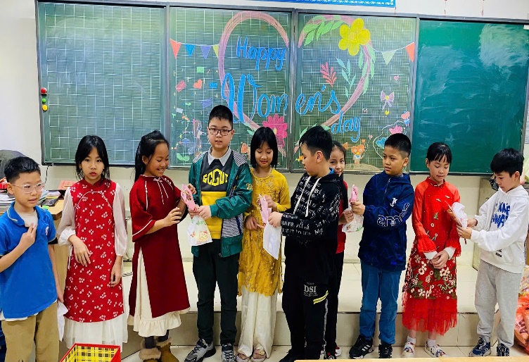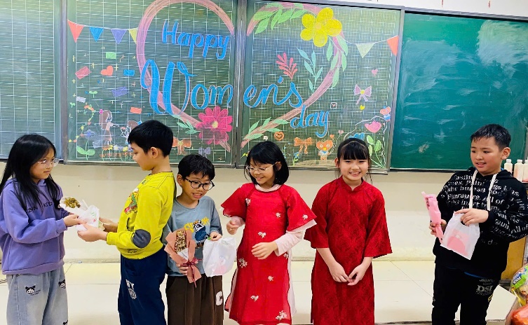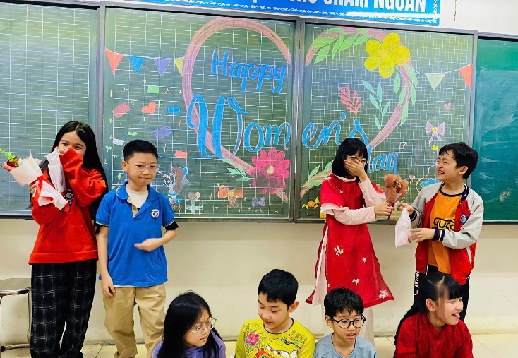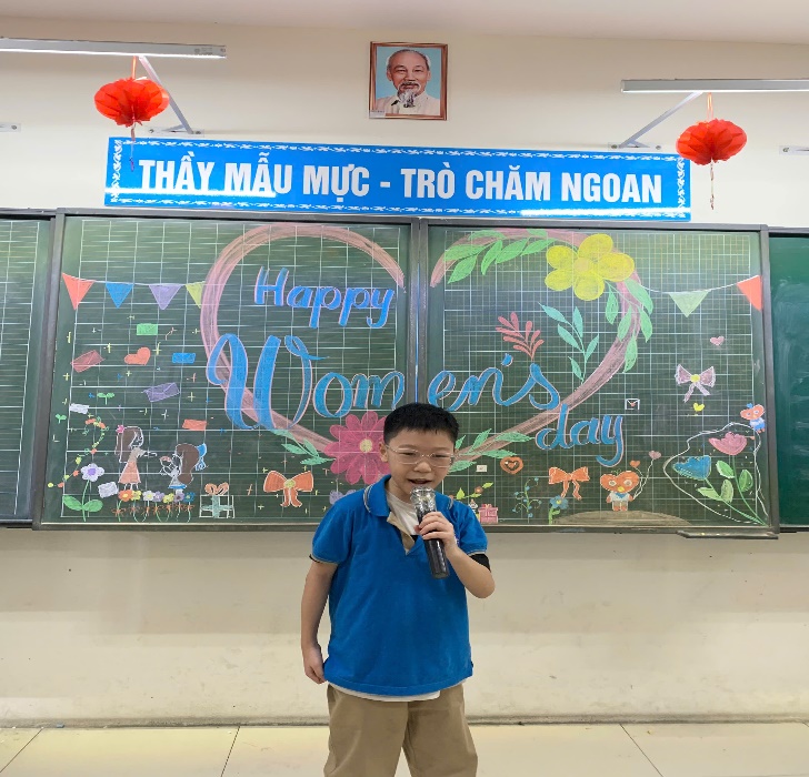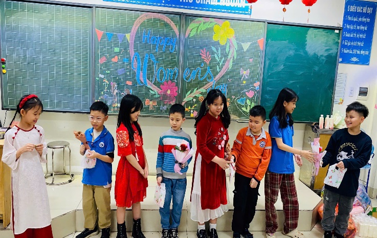 Mở đầu buổi sinh hoạt, bạn Minh Tú đại diện cả lớp gửi lời chúc tốt đẹp nhất đến cô giáo và các bạn nữ. Tiếp theo, cả lớp cùng làm những tấm thiệp xinh xắn để tặng bà, mẹ, chị em gái trong gia đình. Sau đó, các bạn nam trong lớp lên biểu diễn các tiết mục văn nghệ như hát, đọc thơ về mẹ, về cô giáo, … Đặc biệt, tiết mục ảo thuật của bạn Trần Gia Huy khiến cả lớp trầm trồ, thán phục.