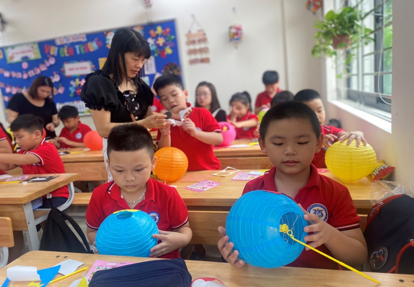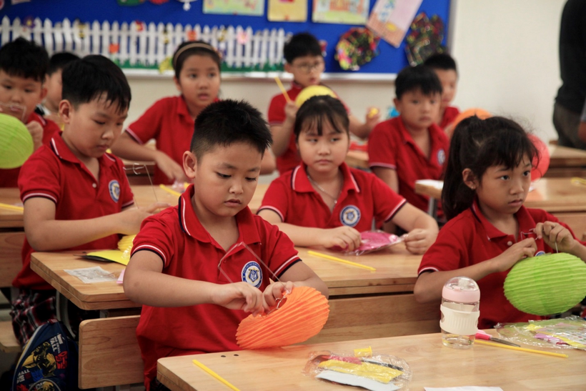 Cả lớp cùng nhau lắp, dán những chiếc đèn lồng thật xinh. Tinh thần lao động quả là hăng say: