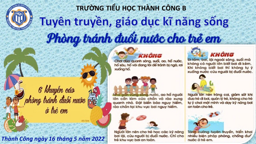 Trước thực trạng đó, trường Tiểu học Thành Công B đã tổ chức buổi sinh hoạt dưới cờ với nội dung sinh hoạt: Phòng tránh tai nạn đuối nước cho trẻ em. Trong buổi sinh hoạt, các con cùng xem, tìm hiểu một số tình huống về tai nạn đuối nước để từ đó phân tích, tìm hiểu thế nào là đuối nước, nguyên nhân dẫn đến đuối nước và cách phòng tránh đuối nước.