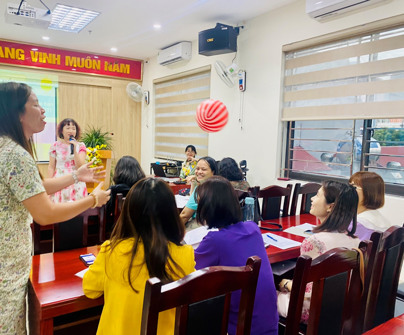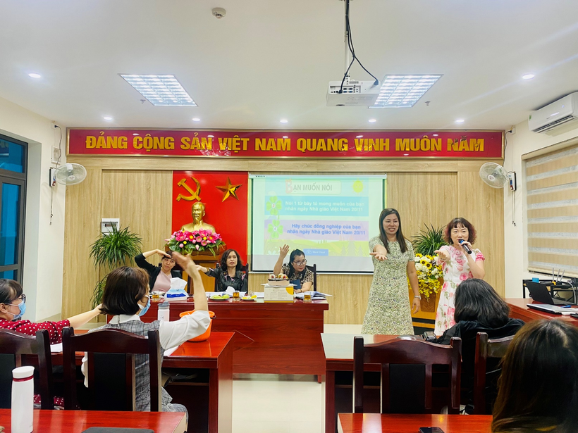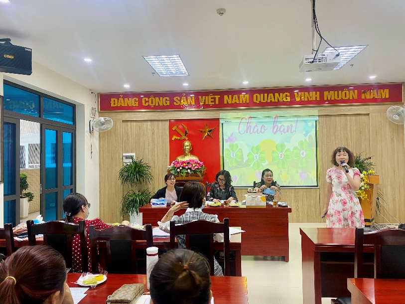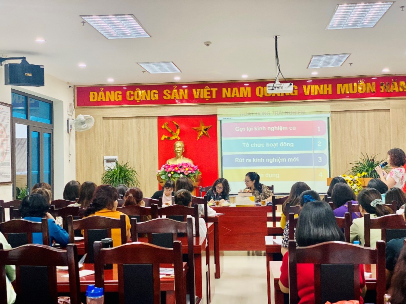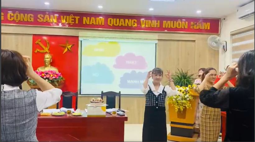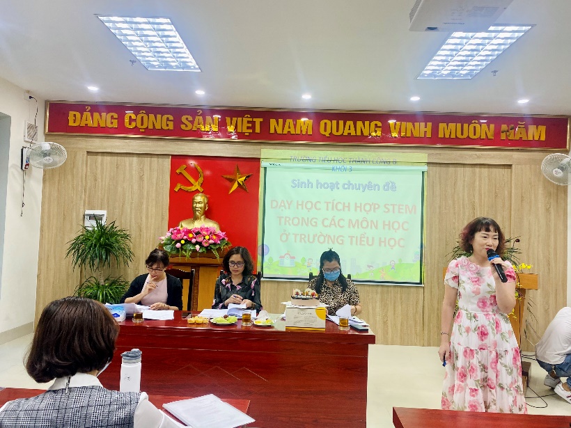 Đồng chí Nguyễn Linh Chi – Khối trưởng CM đại diện khối 3 trình bày chuyên đề cách dạy học Stem thông qua các trò chơi: “Chào bạn” ; “4 động tác vận động”; “Điều muốn nói”. Mỗi 1 trò chơi đều được sự hưởng ứng nhiệt tình của cả hội đồng. Sau khi chia sẻ xong, các GV đã nắm được về phương pháp, cách thức tổ chức dạy học tích hợp Stem trong các môn học.