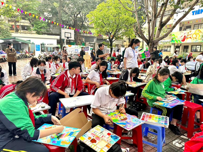 Ngay sau khi học sinh vẽ xong, Nhà trường đã hỗ trợ các em sấy khô bài.