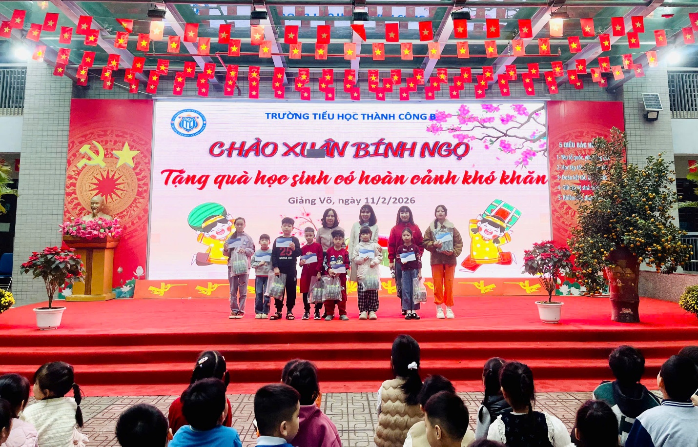 Tiếp nối mạch cảm xúc sẻ chia, nhà trường đã tổ chức trao tặng những phần quà ý nghĩa cho các em học sinh có hoàn cảnh khó khăn. Những món quà tuy nhỏ nhưng chứa đựng tấm lòng nhân ái của đại gia đình Thành Công B, mong muốn mang đến cho các em một cái Tết ấm áp và đủ đầy hơn.