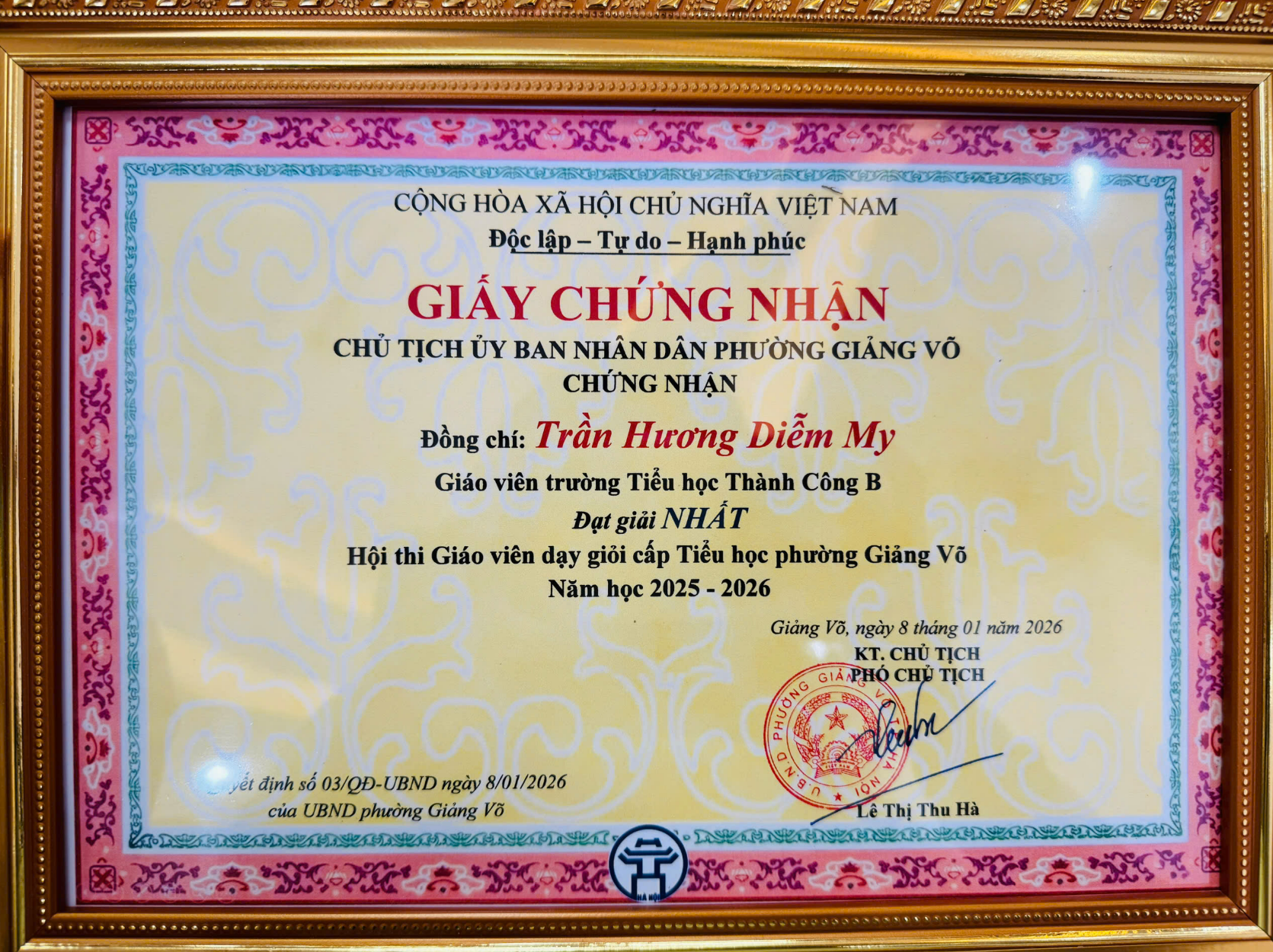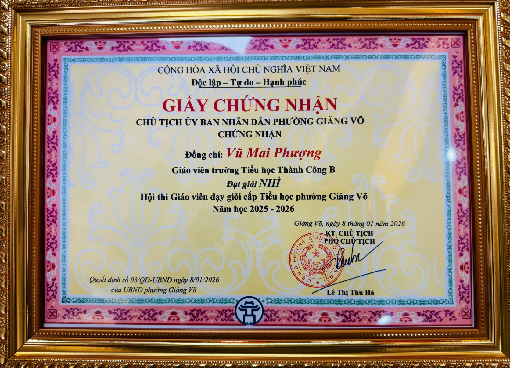 Đặc biệt, Trường Tiểu học Thành Công B vinh dự được biểu dương khi đạt thành tích cao trong Hội thi Giáo viên giỏi cấp Tiểu học của phường Giảng Võ: