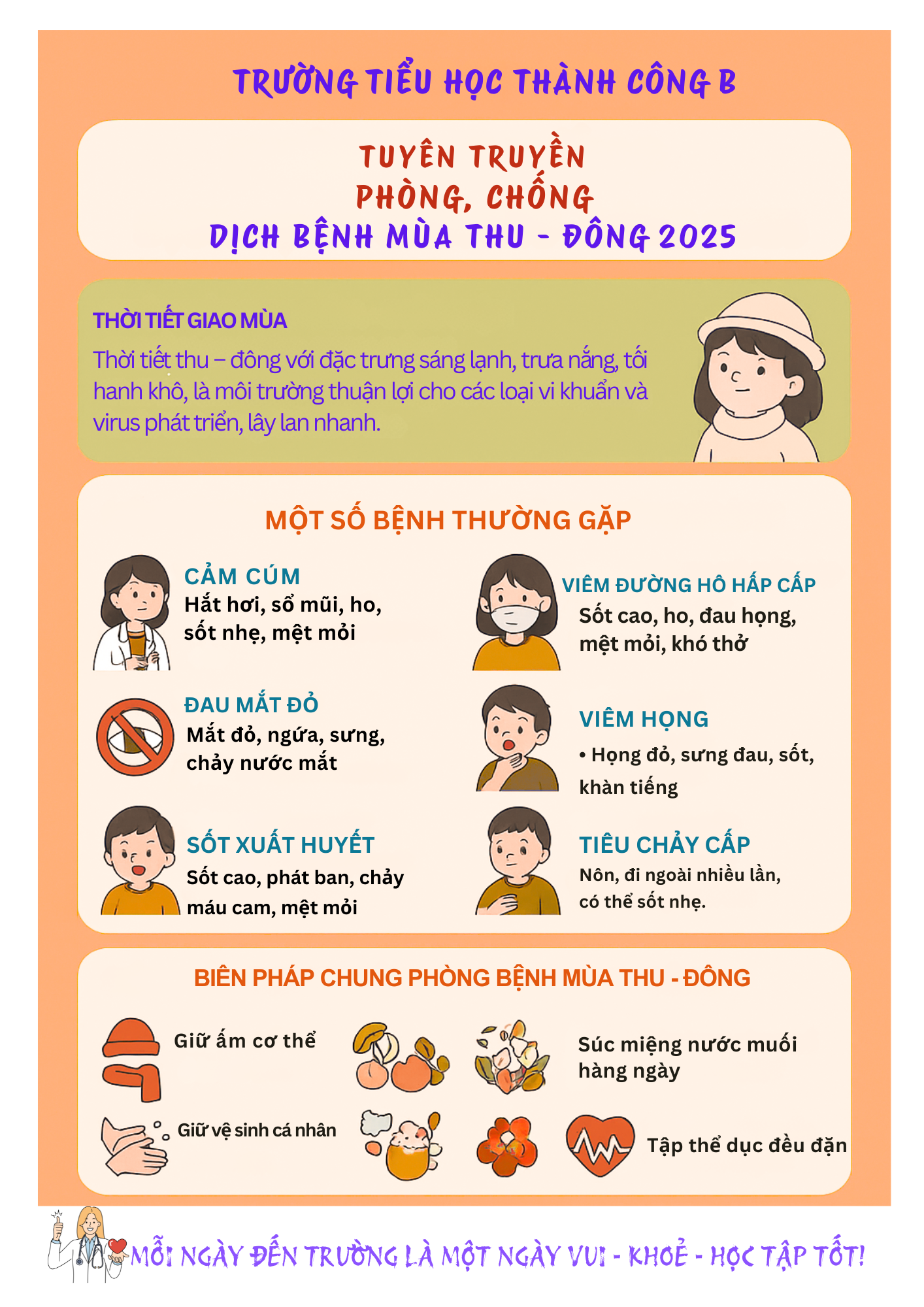 Trường Tiểu học Thành Công B đẩy mạnh công tác tuyên truyền, nâng cao nhận thức cho cán bộ, giáo viên, nhân viên, phụ huynh và học sinh về các bệnh thường gặp khi thời tiết giao mùa, đồng thời hướng dẫn những biện pháp phòng tránh hiệu quả nhằm bảo vệ sức khỏe học sinh, góp phần xây dựng môi trường học đường an toàn – thân thiện – hạnh phúc.