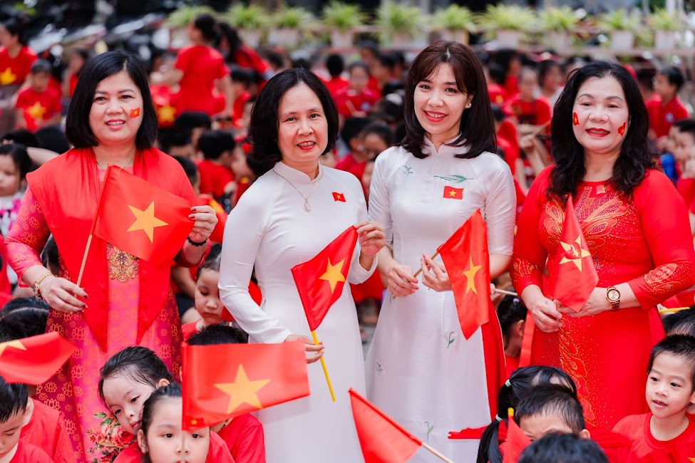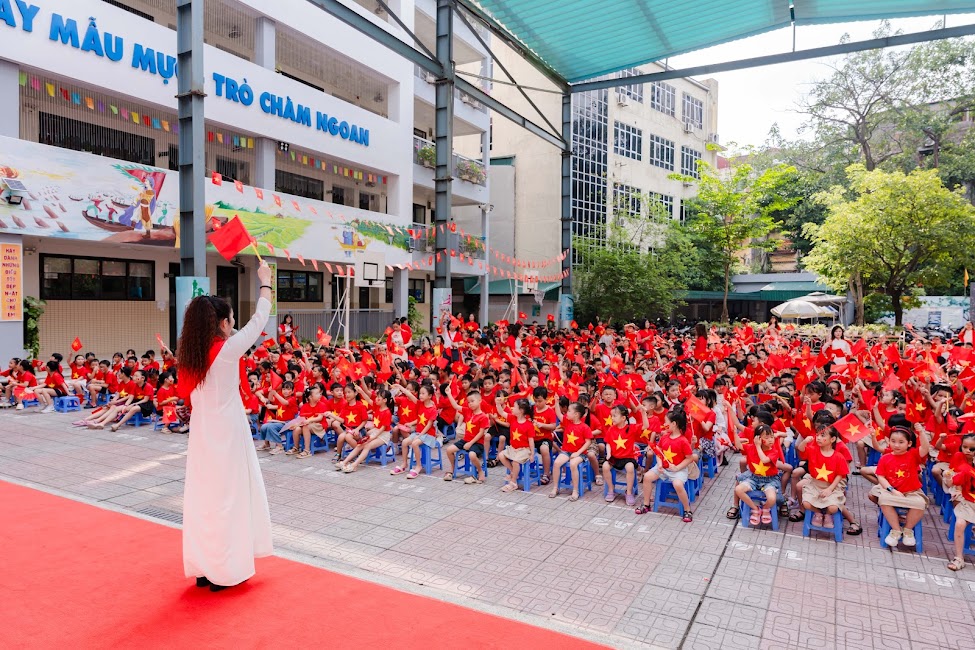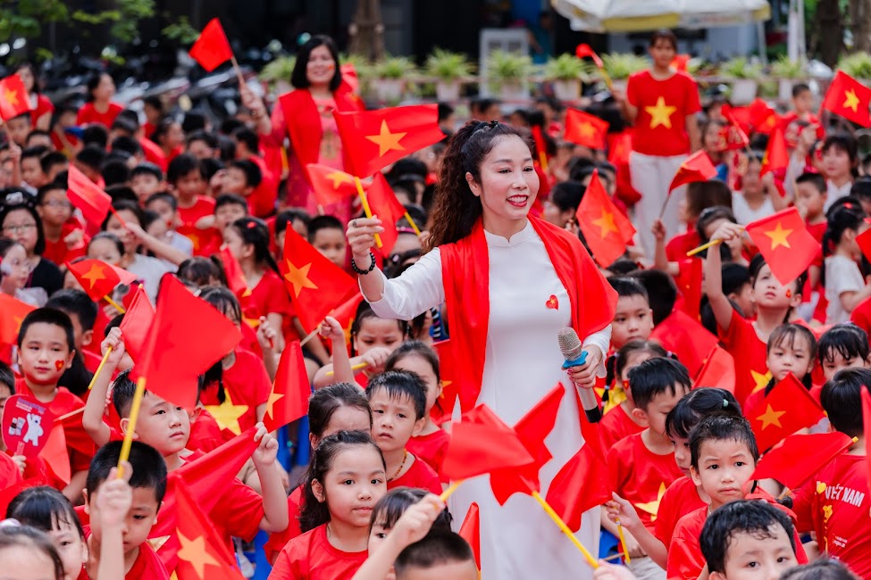 Thầy cô đã kể cho các em nghe về chặng đường 80 năm của đất nước - từ những ngày gian khó, chiến đấu giành độc lập đến hôm nay hoà bình, tươi đẹp - để các em hiểu rằng cuộc sống hôm nay thật đáng quý, hoà bình thật đáng trân trọng. Và khi những giai điệu quen thuộc vang lên: “Ai yêu Bác Hồ Chí Minh hơn thiếu niên nhi đồng”, “Viết tiếp câu chuyện hoà bình”, “Như có Bác trong ngày vui đại thắng”…, giọng hát trong trẻo của học trò quyện cùng giọng hát ấm áp của thầy cô, tạo nên một bản hợp xướng chan chứa tự hào, biết ơn và khát vọng. Các em bé bỏng đặt bàn tay nhỏ lên trái tim, đôi mắt long lanh hướng lên lá cờ - như một lời hứa với Tổ quốc: “Chúng con sẽ học thật giỏi, sống thật tốt để mai này Việt Nam rạng rỡ hơn.”