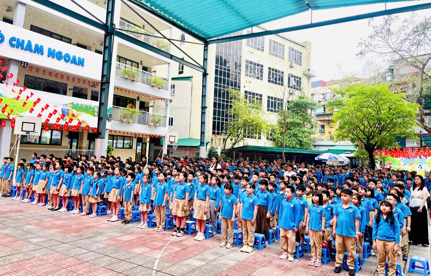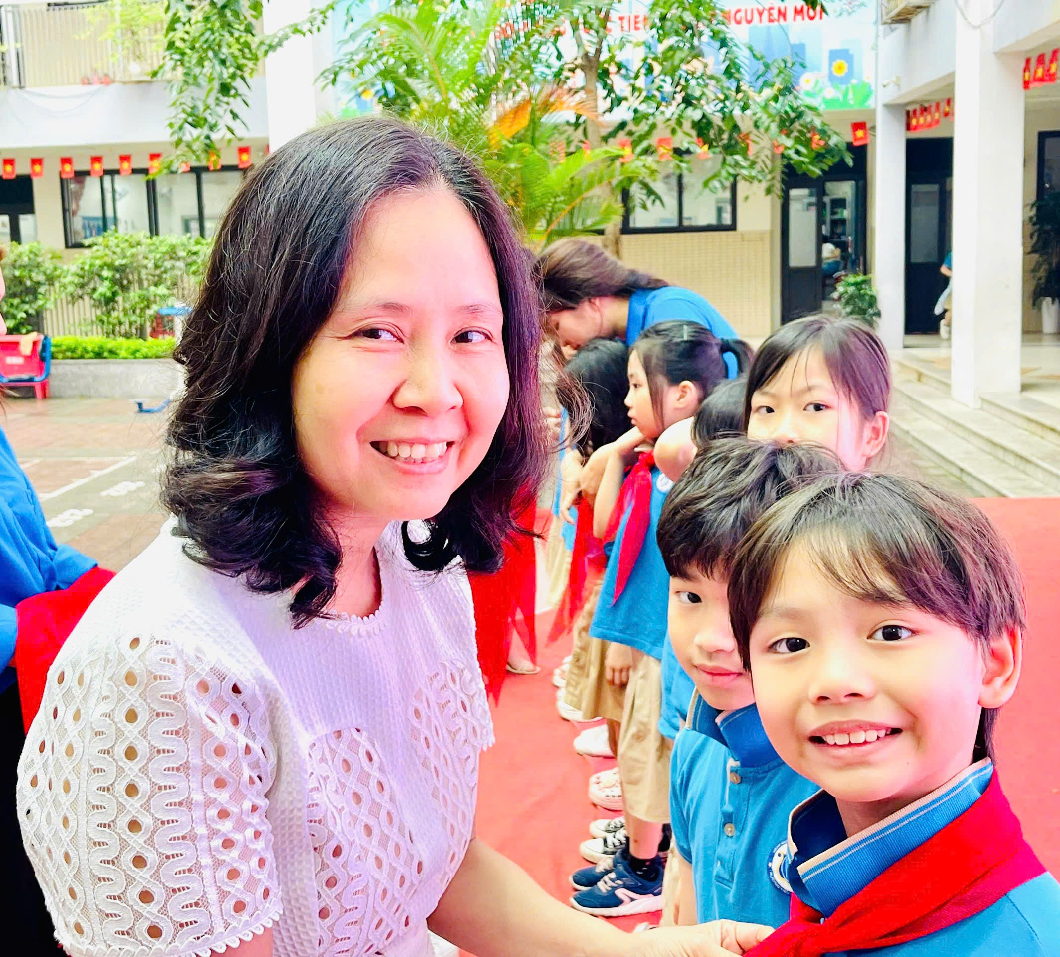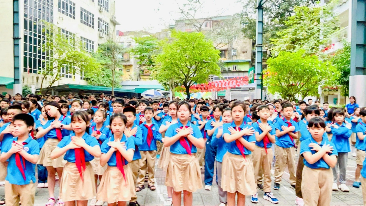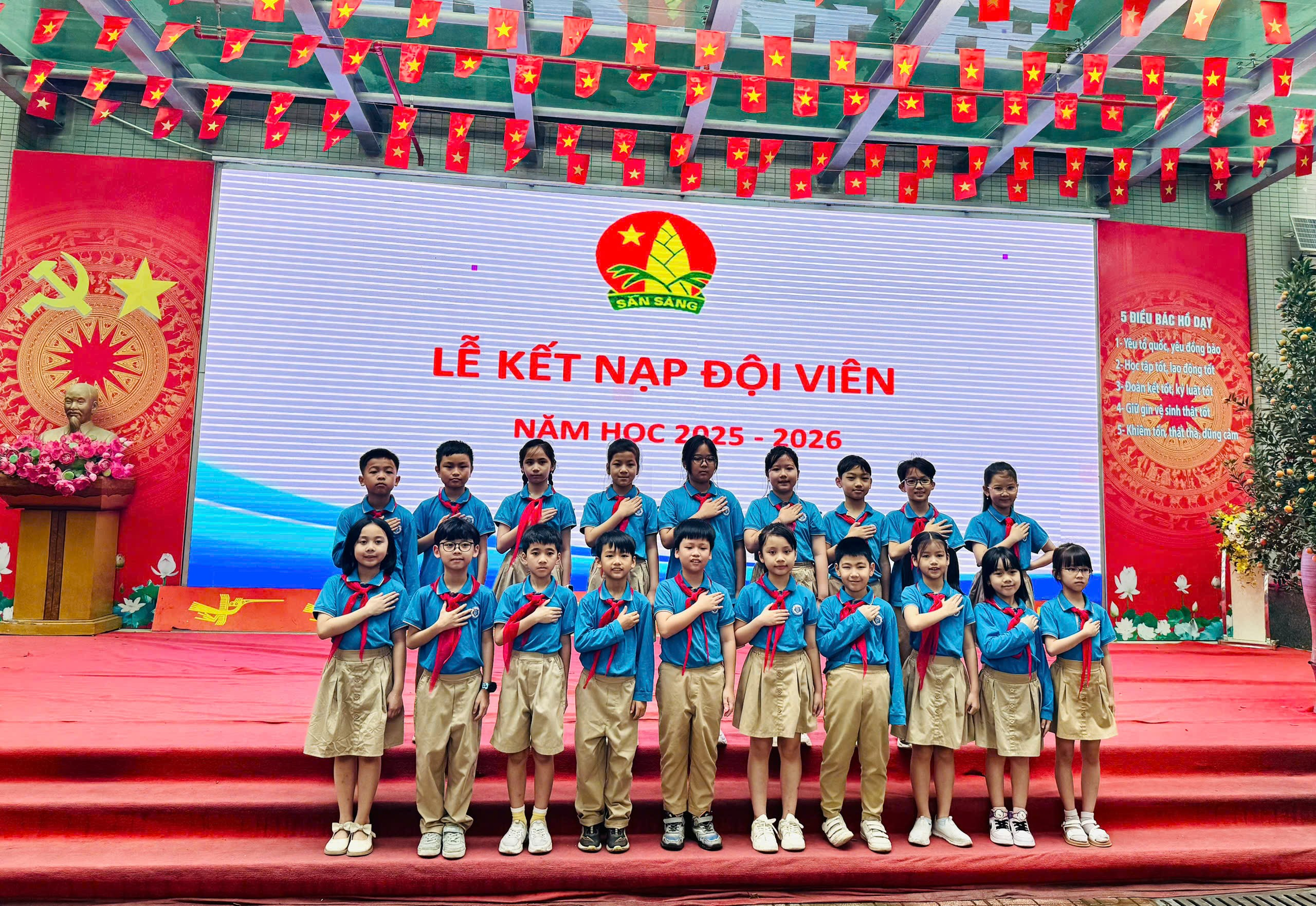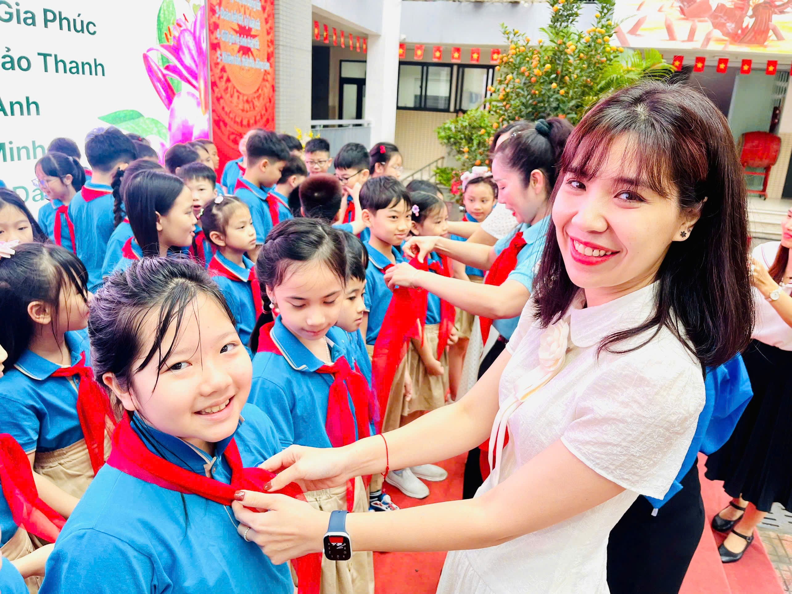 Đặc biệt, buổi lễ trở nên thiêng liêng và xúc động với nghi thức kết nạp Đội viên mới. Trong không khí trang nghiêm, cô Phạm Minh Thảo – Hiệu trưởng nhà trường đã phát biểu chúc mừng, ghi nhận sự cố gắng của các em học sinh và gửi gắm những kỳ vọng tốt đẹp tới các đội viên mới. Cùng với cô Trần Thị Thu Hà – Phó Hiệu trưởng nhà trường, cô Hiệu trưởng đã trực tiếp đeo khăn quàng đỏ cho các em học sinh được kết nạp Đội.