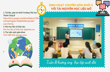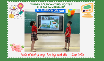Thư viện nhà trường đã tuyên truyền về Tuần lễ hưởng ứng học tập suốt đời năm 2022 trong mỗi tiết học, đồng thời giới thiệu, hướng dẫn các con HS vào các trang Wed hữu ích cho việc đọc sách như SachHayOnline.com; AnyBooks.vn; Sachvui.com;...Thư viện cũng thường xuyên ứng dụng CNTT trong các tiết dạy như giới thiệu sách mới bằng trình chiếu Powerpoint, xem phim tài liệu về ngày trọng đại của dân tộc,khuyến khích các con HS khối 4,5 tham gia Book Review cấp trường,...Nhân dịp tổ chức Tuần lễ hưởng ứng học tập suốt đời và hướng tới kỉ niệm 68 năm Ngày giải phóng Thủ Đô 10/10, Thư viện đã tổ chức triển lãm sách, tài liệu chủ đề “Hà Nội - Ngàn năm văn hiến”.