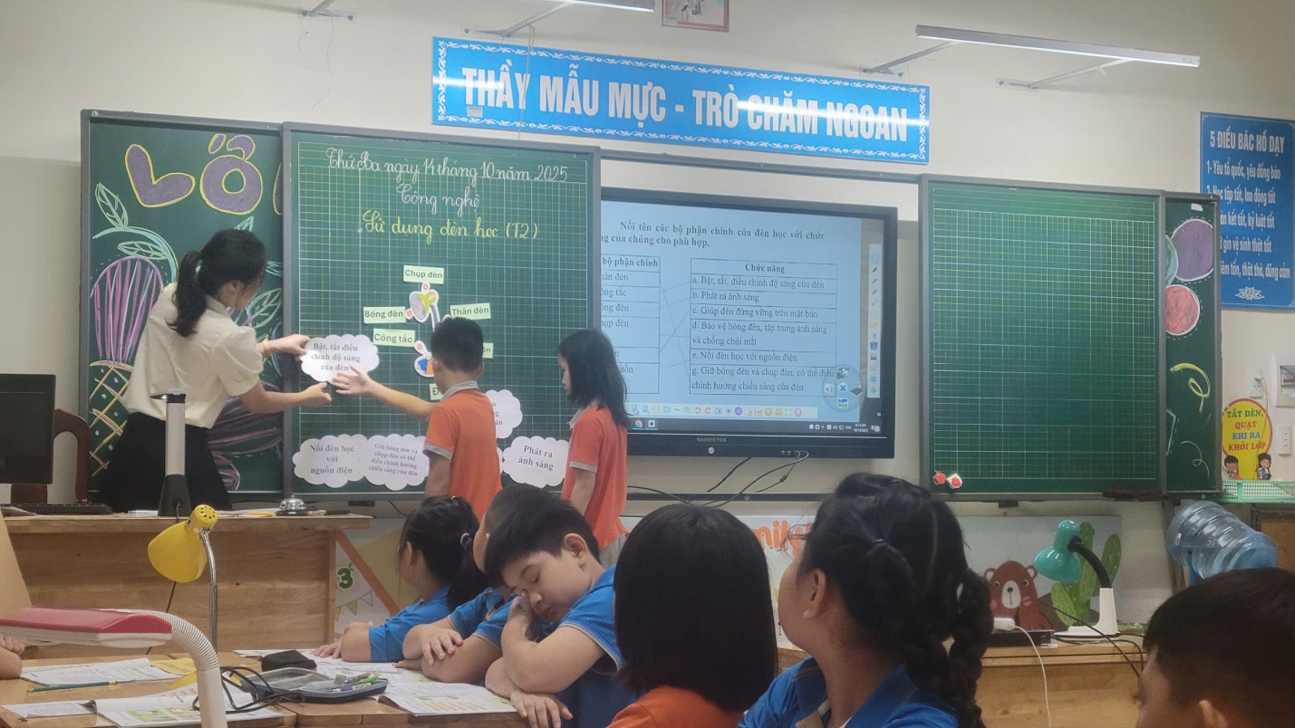 Trong tiết học, cô giáo Ngô Bích Hạnh đã linh hoạt vận dụng các hình thức tổ chức dạy học tích cực, hướng học sinh tìm hiểu cấu tạo, công dụng và cách sử dụng an toàn của đèn học – một thiết bị quen thuộc trong học tập và sinh hoạt hằng ngày. Dưới sự hướng dẫn của cô, học sinh lớp 3A3 tích cực tham gia các hoạt động quan sát, thảo luận, chia sẻ hiểu biết và cùng nhau thực hành qua các trò chơi học tập.