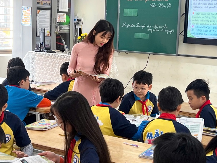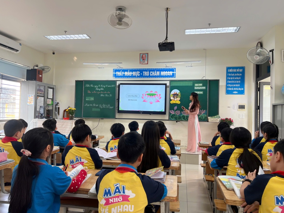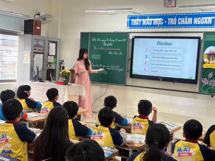 Không chỉ dừng lại ở việc rèn kĩ năng đọc hiểu, cô giáo đã khéo léo dẫn dắt học sinh cảm nhận được nét độc đáo của kiến trúc chùa Một Cột – ngôi chùa có hình dáng như một đóa sen vươn lên giữa lòng hồ, vừa giản dị mà vừa sâu sắc, hàm chứa triết lí nhân văn và tinh thần Phật giáo Việt Nam.