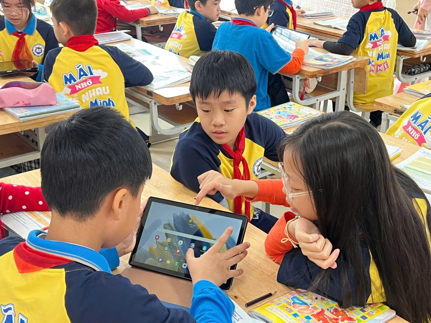 Bên cạnh đó, tiết học còn ghi dấu ấn với việc ứng dụng hiệu quả kĩ năng công dân số. Học sinh được sử dụng máy tính bảng để bày tỏ suy nghĩ, cảm nhận của mình trên trang Padlet, mạnh dạn chia sẻ ý kiến, học cách lắng nghe và tôn trọng quan điểm của bạn bè. Công nghệ không làm lu mờ giá trị truyền thống, mà ngược lại, đã trở thành cầu nối giúp học sinh tiếp cận di sản văn hóa bằng tư duy hiện đại, chủ động và sáng tạo.