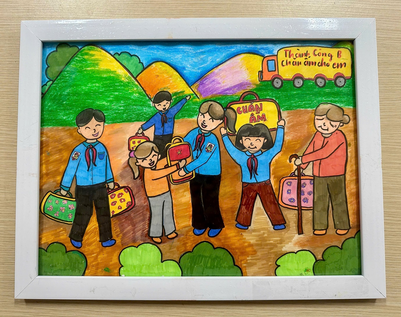 Thông điệp: Em muốn vẽ lại hình ảnh cô Tổng phụ trách và các thầy cô giáo trường em trong chuyến đi từ thiện, trao gửi tình cảm đến các bạn nhỏ và người dân miền núi những chiếc chăn ấm trước khi mùa đông về.
