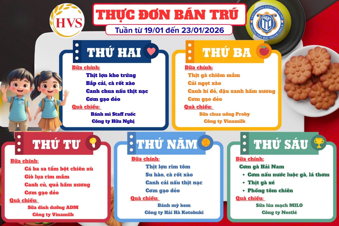 Kính gửi: Quý CMHS trường Tiểu học Thành Công B. Thực đơn bán trú từ ngày 19/1 đến ngày 23/1. Trân trọng!