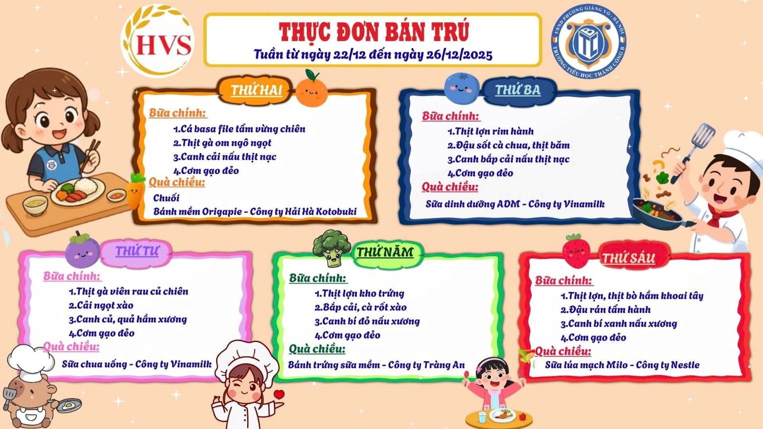 Kính gửi: Quý Phụ huynh trường Tiểu học Thành Công B. Thực đơn bán trú từ ngày 22/12 đến ngày 26/12. Trân trọng!