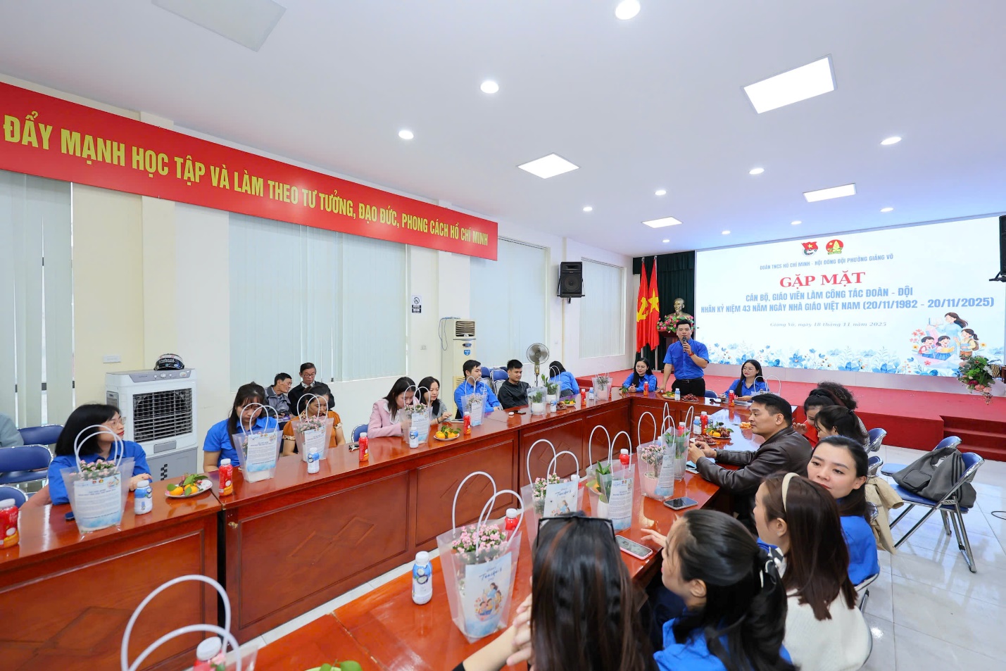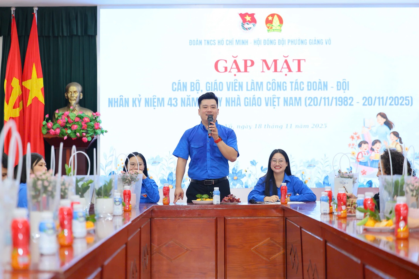 Tiếp theo, các đại biểu và thầy cô đã được lắng nghe lời phát biểu của đồng chí Vũ Tùng Dương – Bí thư Đoàn phường Giảng Võ. Đồng chí ghi nhận những đóng góp tích cực của đội ngũ cán bộ, giáo viên phụ trách công tác Đoàn – Đội trên địa bàn phường; đồng thời bày tỏ niềm tin vào tinh thần trách nhiệm, lòng nhiệt huyết và sự tận tâm của các thầy cô trong việc đồng hành cùng đội viên, thiếu nhi.