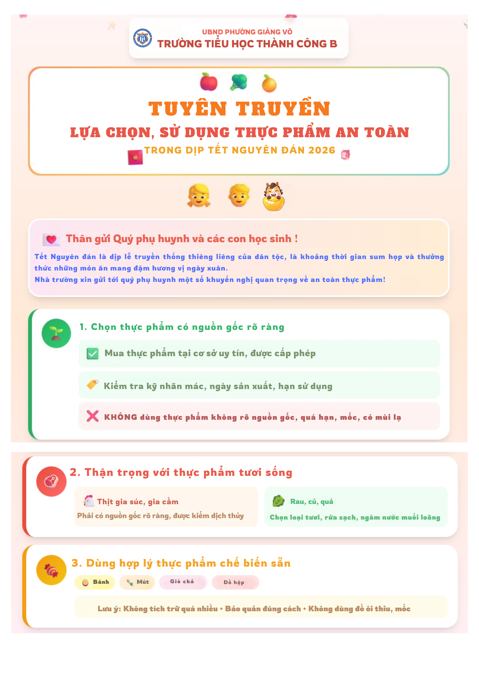 Nhằm góp phần bảo vệ sức khỏe cho cán bộ, giáo viên, nhân viên, phụ huynh và đặc biệt là các em học sinh, Trường Tiểu học Thành Công B xin gửi tới quý phụ huynh một số khuyến nghị quan trọng trong việc lựa chọn, chế biến và sử dụng thực phẩm an toàn trong dịp Tết Nguyên đán 2026: