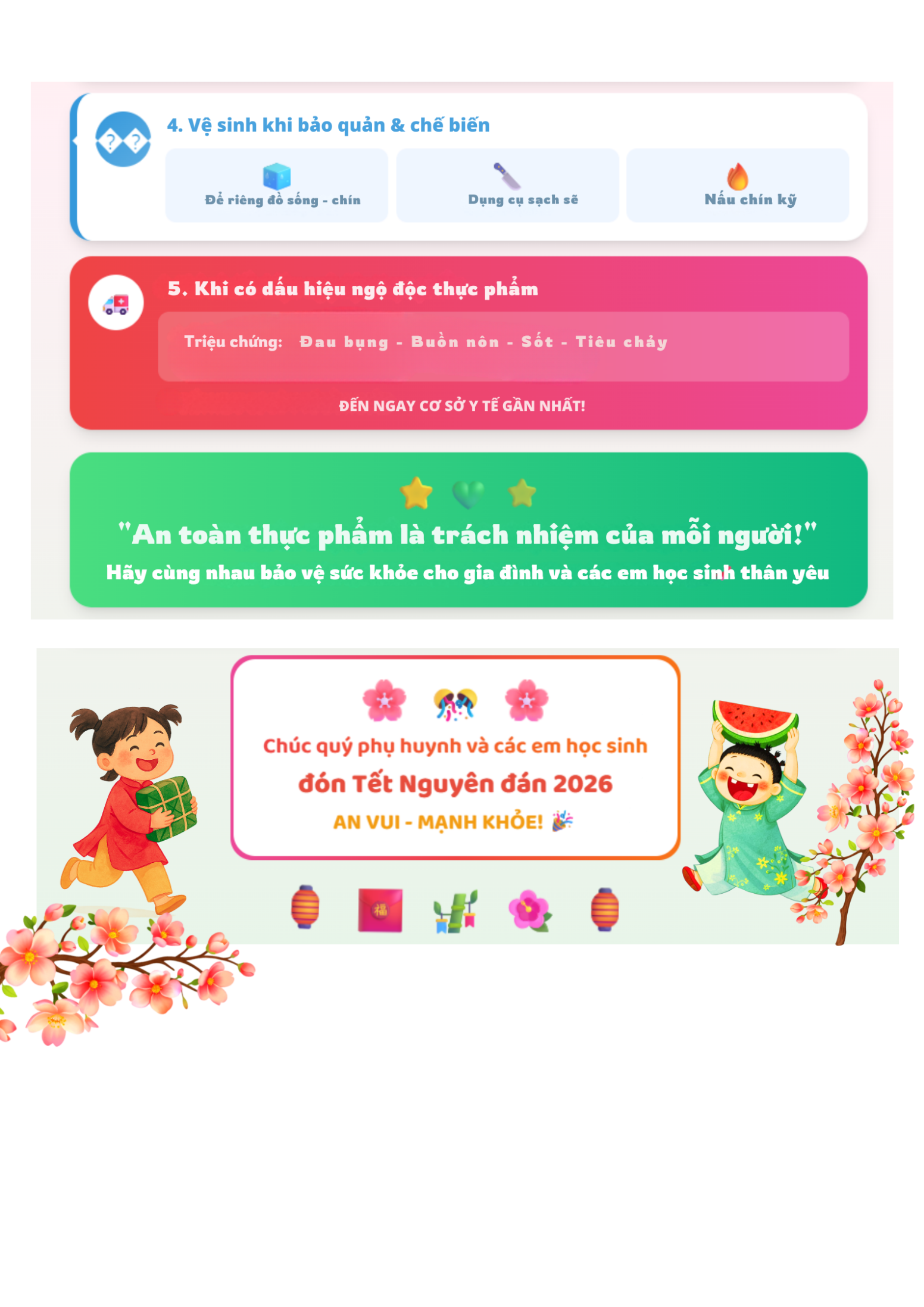 Trường Tiểu học Thành Công B mong rằng mỗi cán bộ, giáo viên, nhân viên và quý phụ huynh sẽ nâng cao ý thức, thực hiện nghiêm các quy định về an toàn thực phẩm, góp phần mang đến một mùa Tết an lành – khỏe mạnh – trọn vẹn yêu thương cho mỗi gia đình và cho các em học sinh thân yêu.