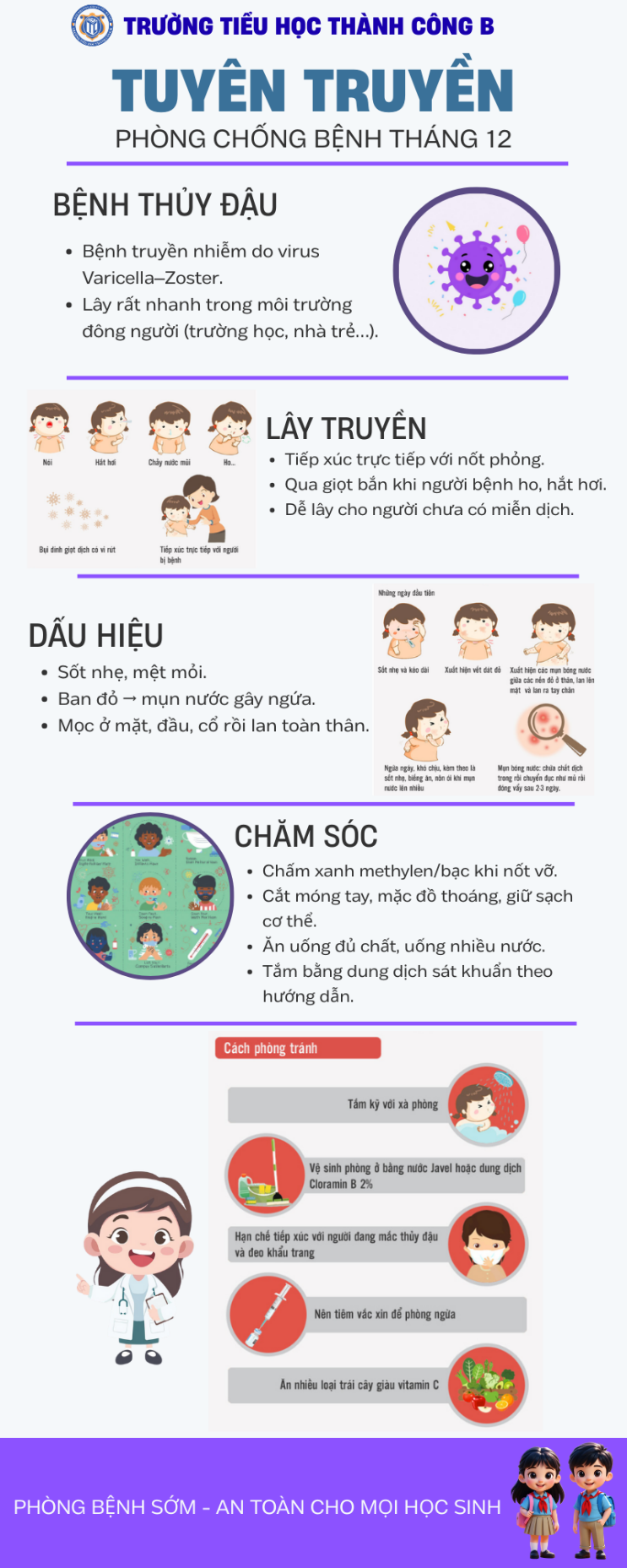 Hiện nay thời tiết đang giao mùa, độ ẩm không khí rất cao là môi trường thuận lợi cho một số bệnh truyền nhiễm bùng phát và lây lan nghiêm trọng đặc biệt là bệnh thủy đậu bắt đầu xuất hiện và ngày càng tăng nhanh tại các khu vực dân cư đông đúc như nhà trẻ , mẫu giáo , trường học … Để chủ động phòng tránh được dịch bệnh các đồng chí giáo viên trong trường đã tích cực tuyên truyền tới các bậc phụ huynh, học sinh có thêm kiến thức , kỹ năng phòng tránh bệnh thủy đậu .