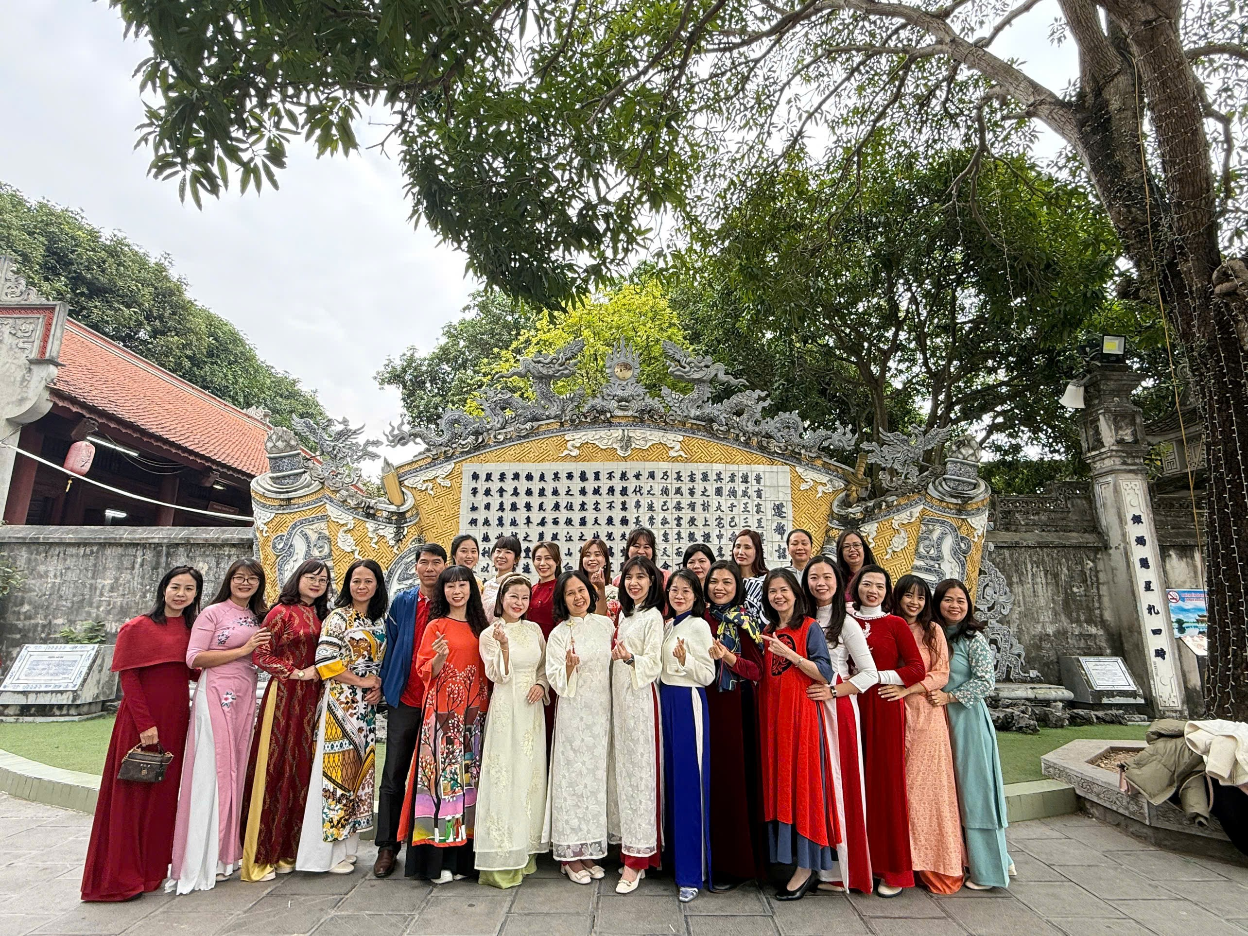 Các đảng viên Chi bộ trường Tiểu học B lưu giữ khoảnh khắc kỉ niệm bên bức Chiếu dời đô – biểu tượng cho khát vọng độc lập và tầm nhìn thiên niên kỷ của dân tộc tại Đền Đô."