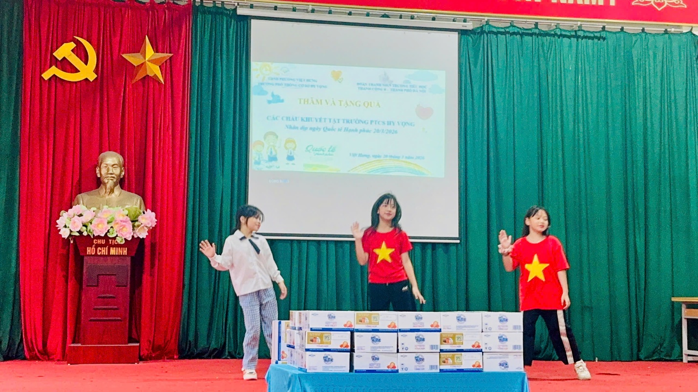 Các em học sinh của trường PTCS Hy vọng rất vui và hạnh phúc khi nhận được sự quan tâm là những món quà của Chi đoàn Thanh niên trường Tiểu học Thành Công B. Đáp lại tình cảm ấm áp này các bạn học sinh ở đây đã có những tiết mục văn nghệ “cây nhà lá vườn” gửi đến đoàn.