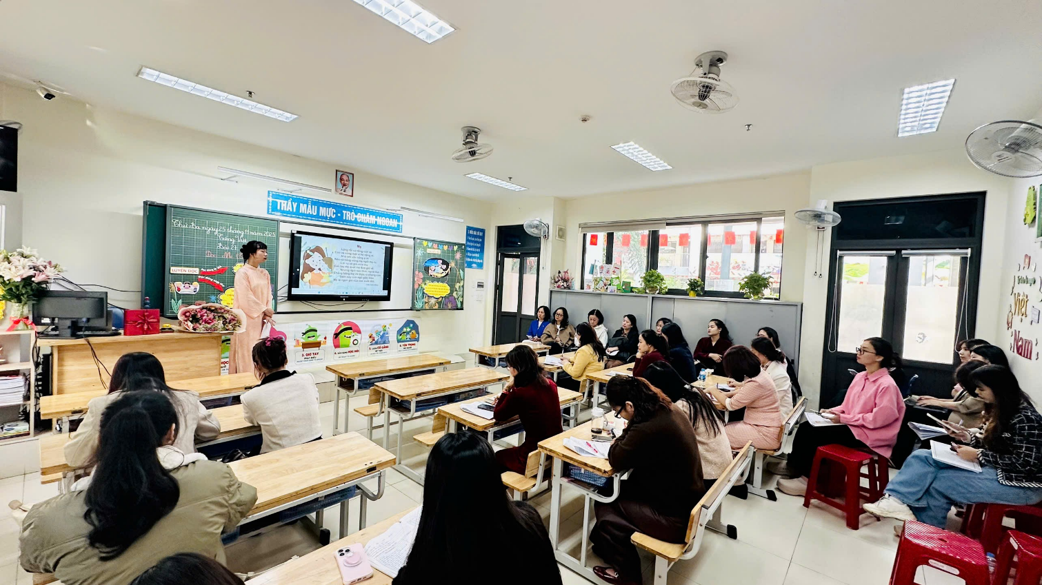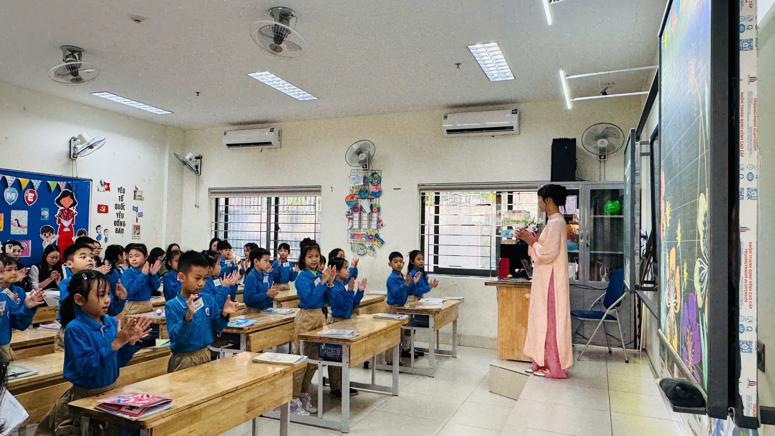 Buổi chuyên đề khép lại với những tràng pháo tay và lời chúc mừng dành cho cô giáo Đào Hương Giang. Tiết học “Mẹ” không chỉ mang đến những trải nghiệm học tập sâu sắc cho học sinh, mà còn góp phần lan tỏa tinh thần đổi mới, ứng dụng công nghệ hiện đại vào dạy học – một hướng đi bền vững trong giáo dục tiểu học hiện nay.