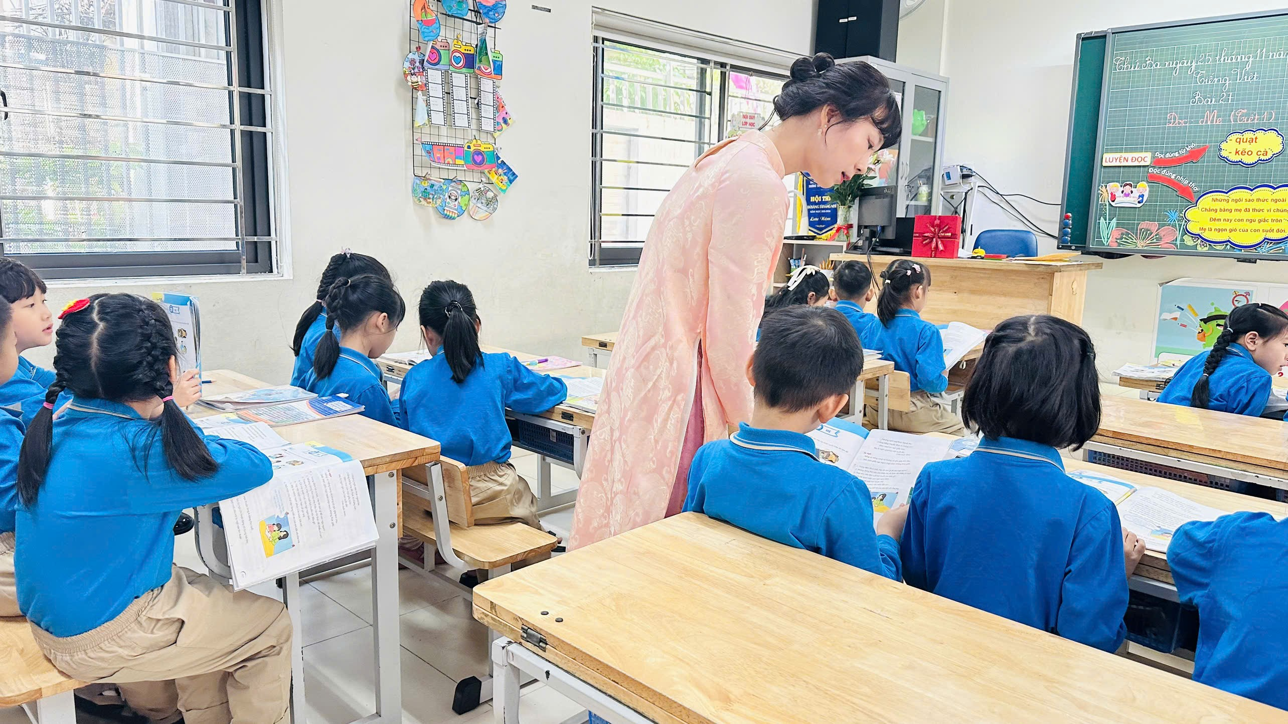 Ngay từ những phút đầu tiên, lớp học đã trở nên sinh động, cuốn hút bởi cách dẫn dắt nhẹ nhàng nhưng đầy cảm xúc của cô Giang. Điểm sáng của bài dạy là cô giáo đã linh hoạt phân bổ nội dung giữa hai tiết của bài học, bảo đảm tiến trình mạch lạc, dễ hiểu, nhưng vẫn giữ được sự hấp dẫn đối với học sinh lớp 2. Đặc biệt, phần giải nghĩa từ không chỉ được thực hiện trong phần luyện đọc như cách làm thông thường, mà còn được lồng ghép tự nhiên vào phần Tìm hiểu bài. Cách triển khai này giúp học sinh hiểu từ trong ngữ cảnh, từ đó nắm bắt nội dung bài thơ sâu sắc và chân thực hơn. Nhiều học sinh đã thể hiện sự hứng thú khi được giải thích trực tiếp những từ ngữ gợi tả về hình ảnh và tình cảm thiêng liêng dành cho mẹ.