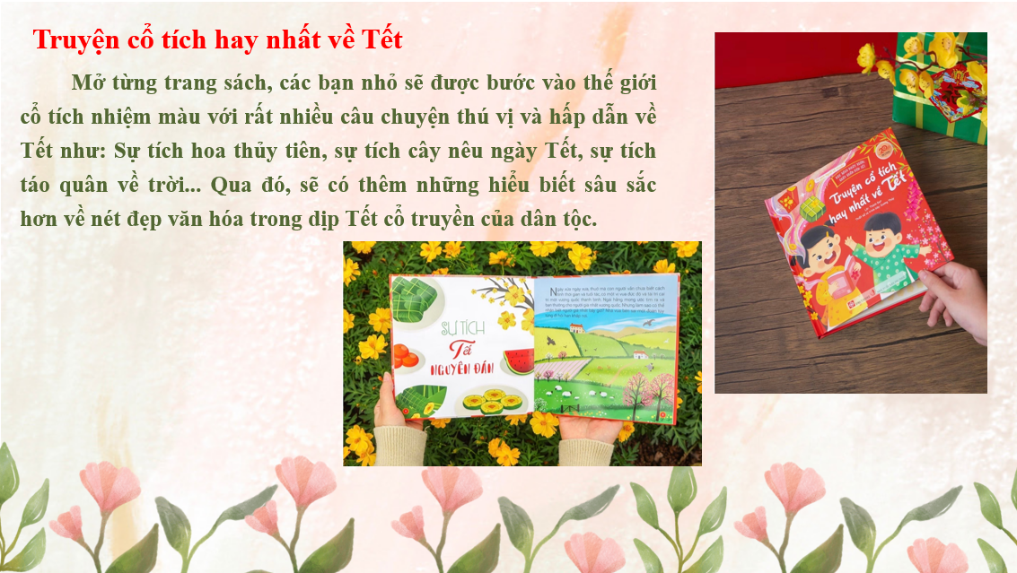 Cuốn sách như một “mâm cỗ tinh thần” ngày xuân, đưa các em bước vào thế giới cổ tích nhiệm màu với những câu chuyện quen thuộc, giàu ý nghĩa về Tết cổ truyền dân tộc như: Sự tích hoa thủy tiên, Sự tích cây nêu ngày Tết, Sự tích Táo quân về trời…