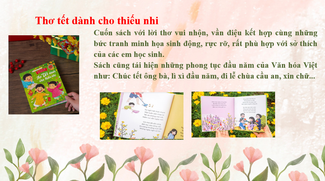 Không chỉ dừng lại ở những câu chuyện cổ tích, sách còn mang đến những bài thơ Tết vui nhộn, vần điệu trong sáng, kết hợp cùng tranh minh họa rực rỡ, sinh động. Những nét đẹp văn hóa đầu năm như chúc Tết ông bà, lì xì đầu năm, đi lễ chùa cầu an, xin chữ đầu xuân… được tái hiện gần gũi, giúp các em thêm yêu Tết Việt.