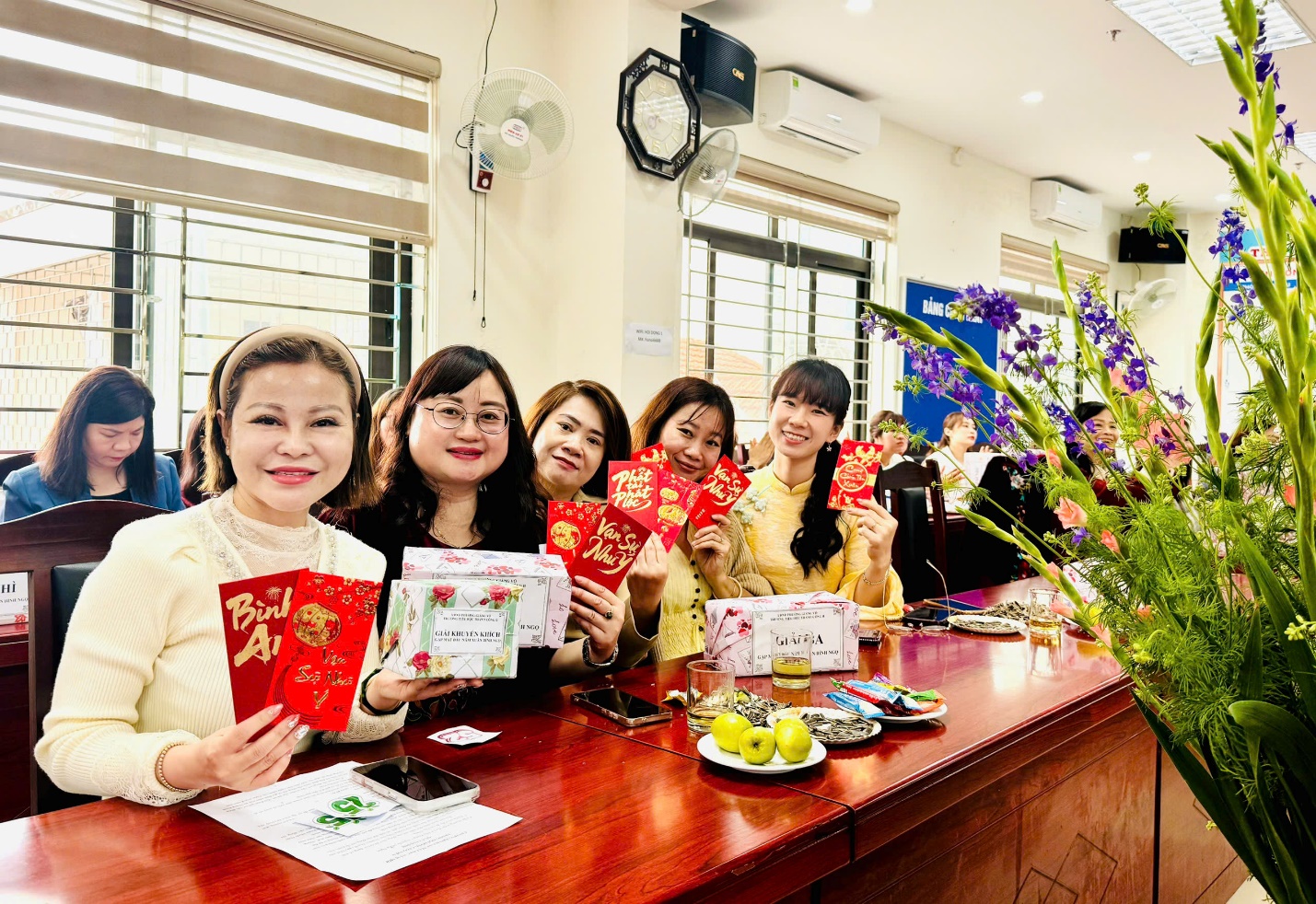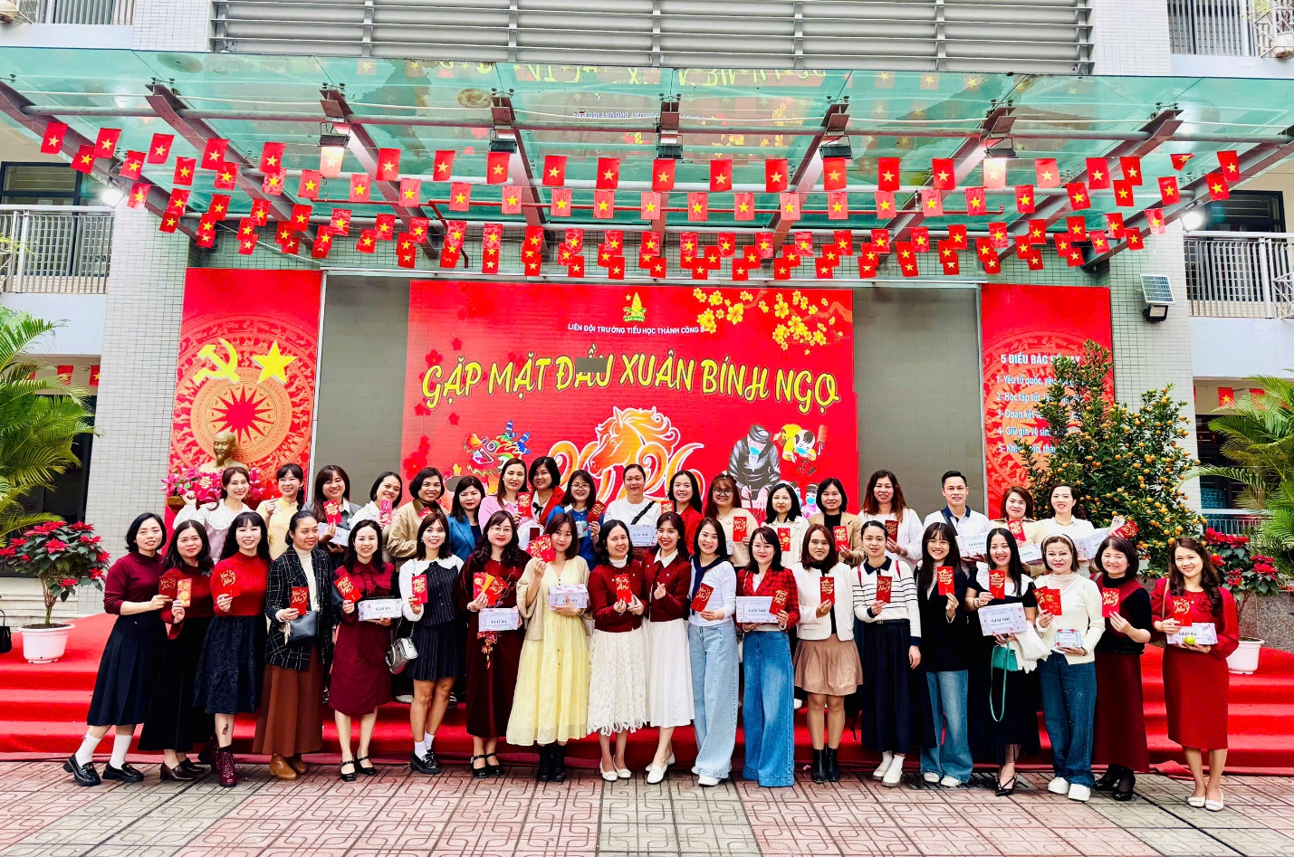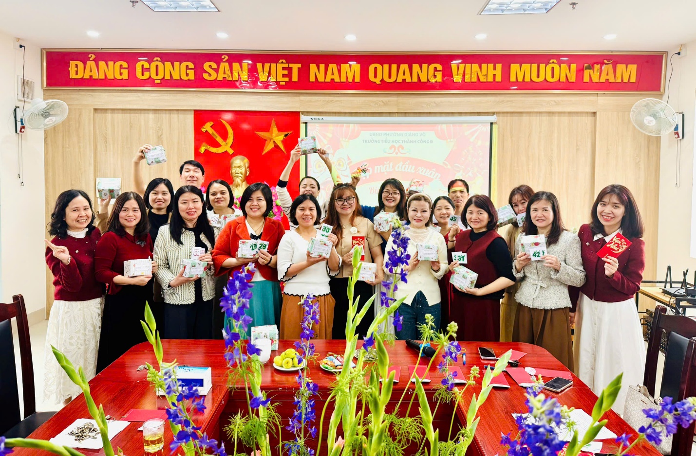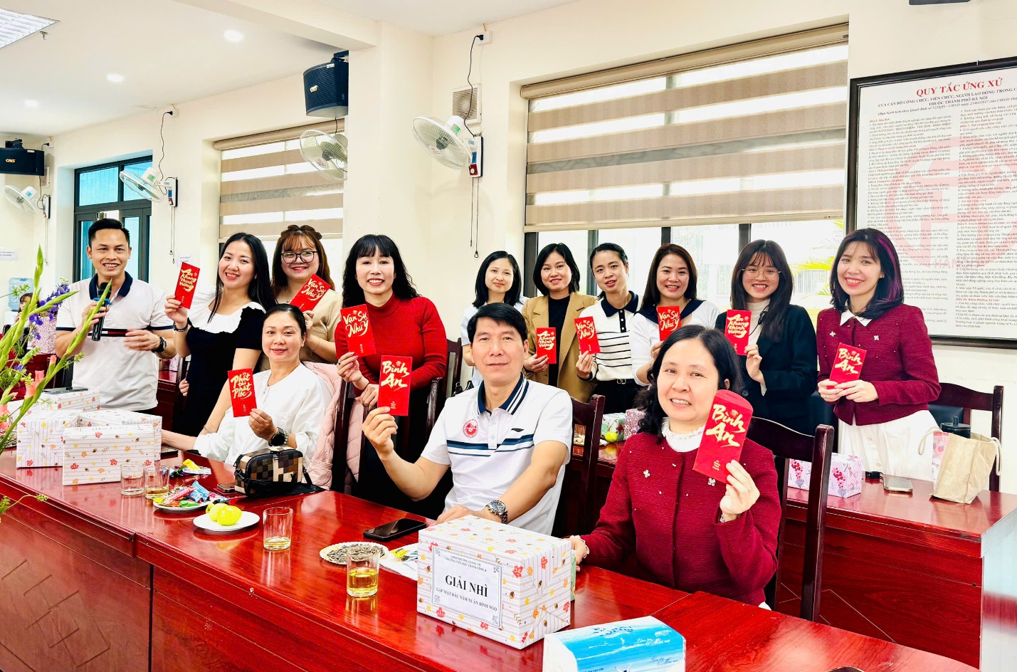 Ngay sau những lời chúc mừng tốt đẹp, Ban Giám hiệu nhà trường đã trân trọng trao gửi những phong bao lì xì đỏ thắm tới tận tay toàn thể hội đồng sư phạm. Từng nụ cười rạng rỡ đọng trên môi, từng cái bắt tay thật chặt đã làm bừng sáng thêm bầu không khí thân tình. Món quà nhỏ nhưng chứa đựng ý nghĩa lớn lao, mang theo lộc xuân và niềm tin về một năm mới may mắn, hanh thông, vạn sự như ý đến với mọi thành viên.