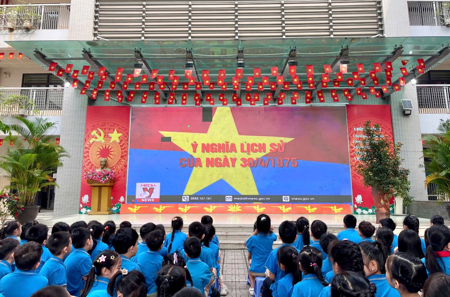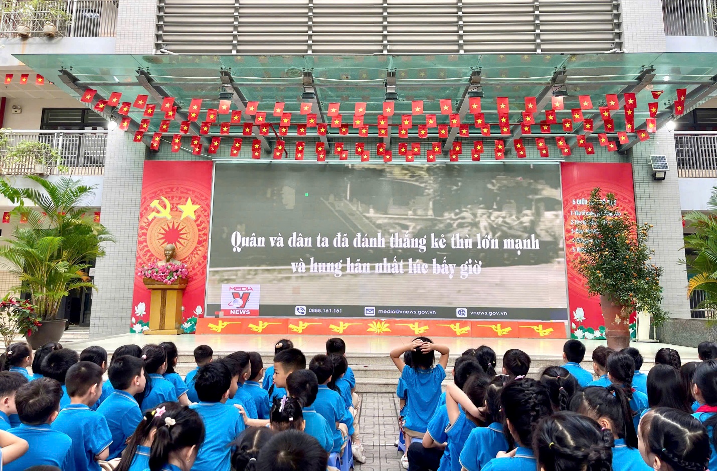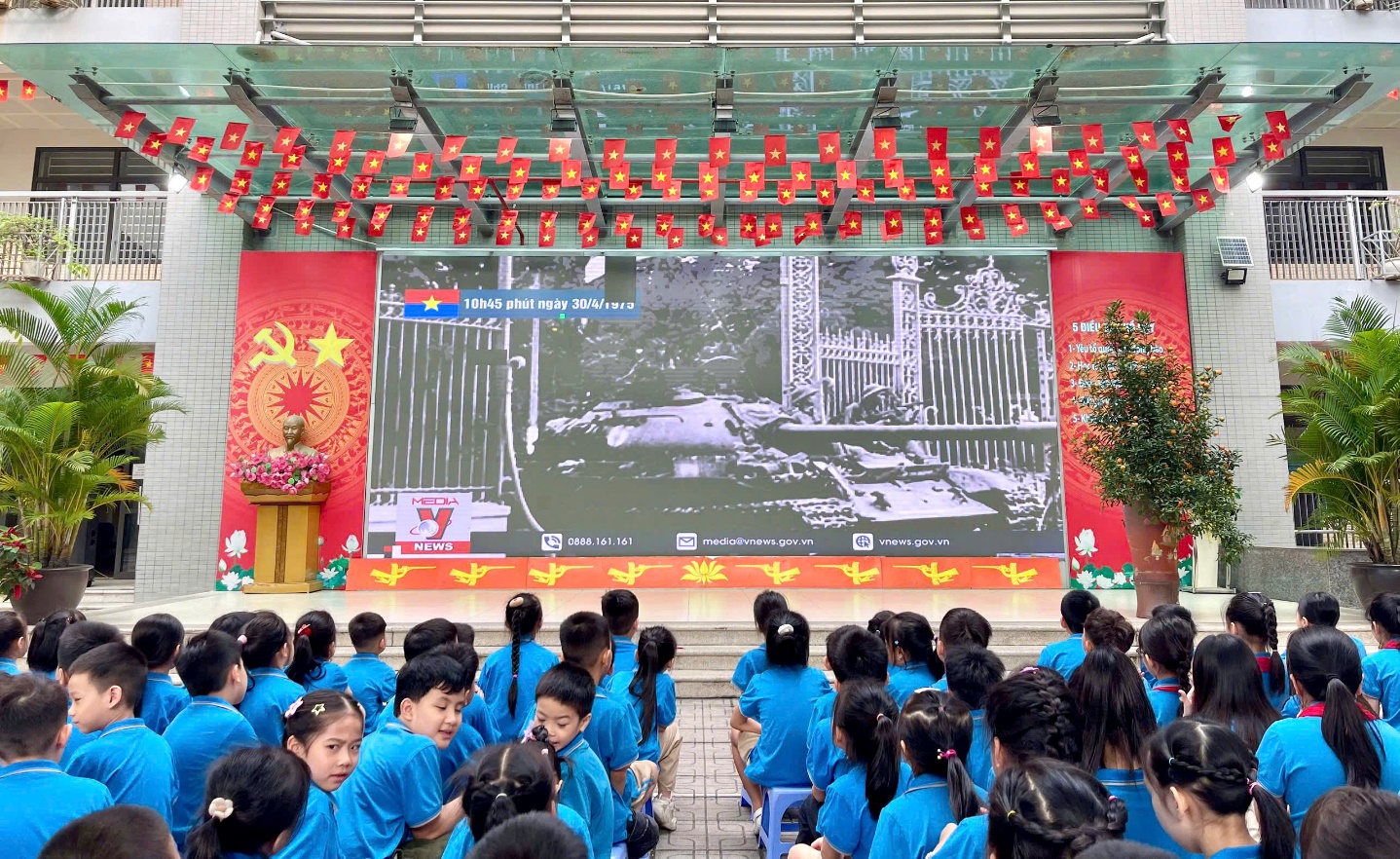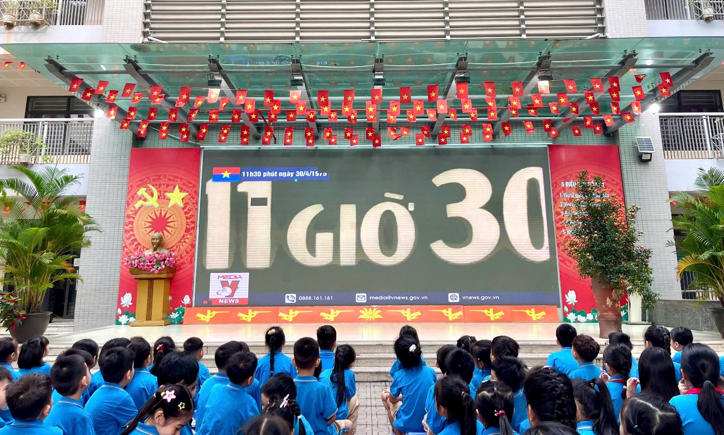 Để giúp các con hiểu rõ hơn về giá trị của độc lập, tự do, nhà trường đã tổ chức buổi chiếu phim tư liệu ngắn về ý nghĩa lịch sử của ngày 30/04/1975. Những hình ảnh chân thực về đoàn quân giải phóng tiến vào Dinh Độc Lập, khoảnh khắc lá cờ cách mạng tung bay trên nóc dinh đã khiến cả sân trường như lặng đi vì xúc động. Qua những thước phim quý giá ấy, các con học sinh đã hiểu thêm về ý chí kiên cường, bất khuất của dân tộc Việt Nam, từ đó bồi đắp thêm tình yêu quê hương đất nước ngay từ khi còn ngồi trên ghế nhà trường.