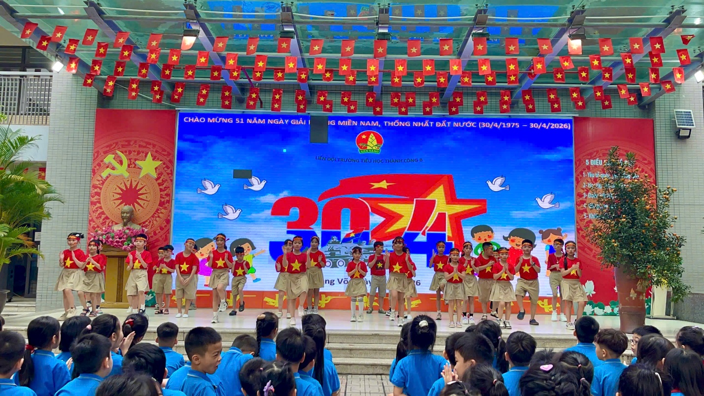 Mở đầu buổi lễ, toàn thể thầy cô giáo và các con học sinh đã thực hiện nghi lễ Chào cờ đầy trang trọng. Trong giai điệu hào hùng của bài Tiến quân ca, hàng nghìn đôi mắt trẻ thơ đều hướng về lá cờ đỏ sao vàng đang tung bay giữa khoảng trời xanh của mái trường Thành Công B. Sự nghiêm trang, thành kính hiện rõ trên từng khuôn mặt nhỏ nhắn, thể hiện lòng biết ơn sâu sắc và niềm tự hào của thế hệ măng non đối với sự hy sinh của các thế hệ cha anh đi trước.