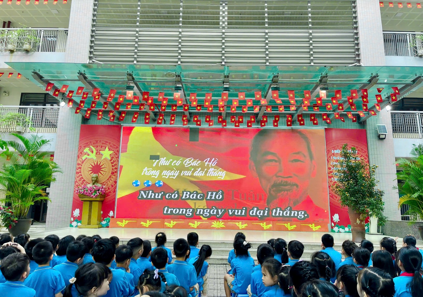 Khép lại chương trình, không gian sân trường Thành Công B như vỡ òa trong niềm xúc động tự hào khi hàng ngàn thầy và trò cùng đồng thanh cất vang bài hát “Như có Bác Hồ trong ngày vui đại thắng”.