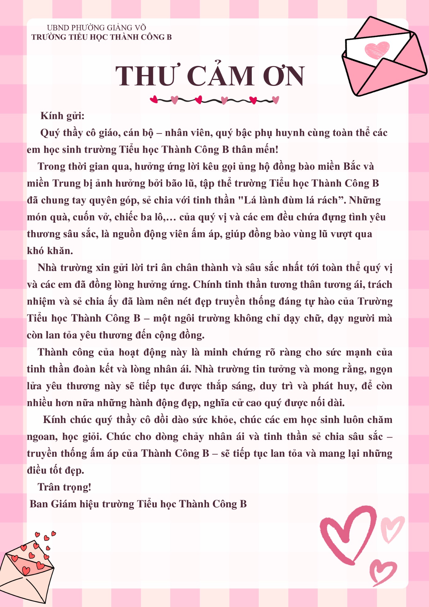Kính gửi: Quý thầy cô giáo, cán bộ – nhân viên, quý bậc phụ huynh cùng toàn thể các em học sinh trường Tiểu học Thành Công B thân mến!
