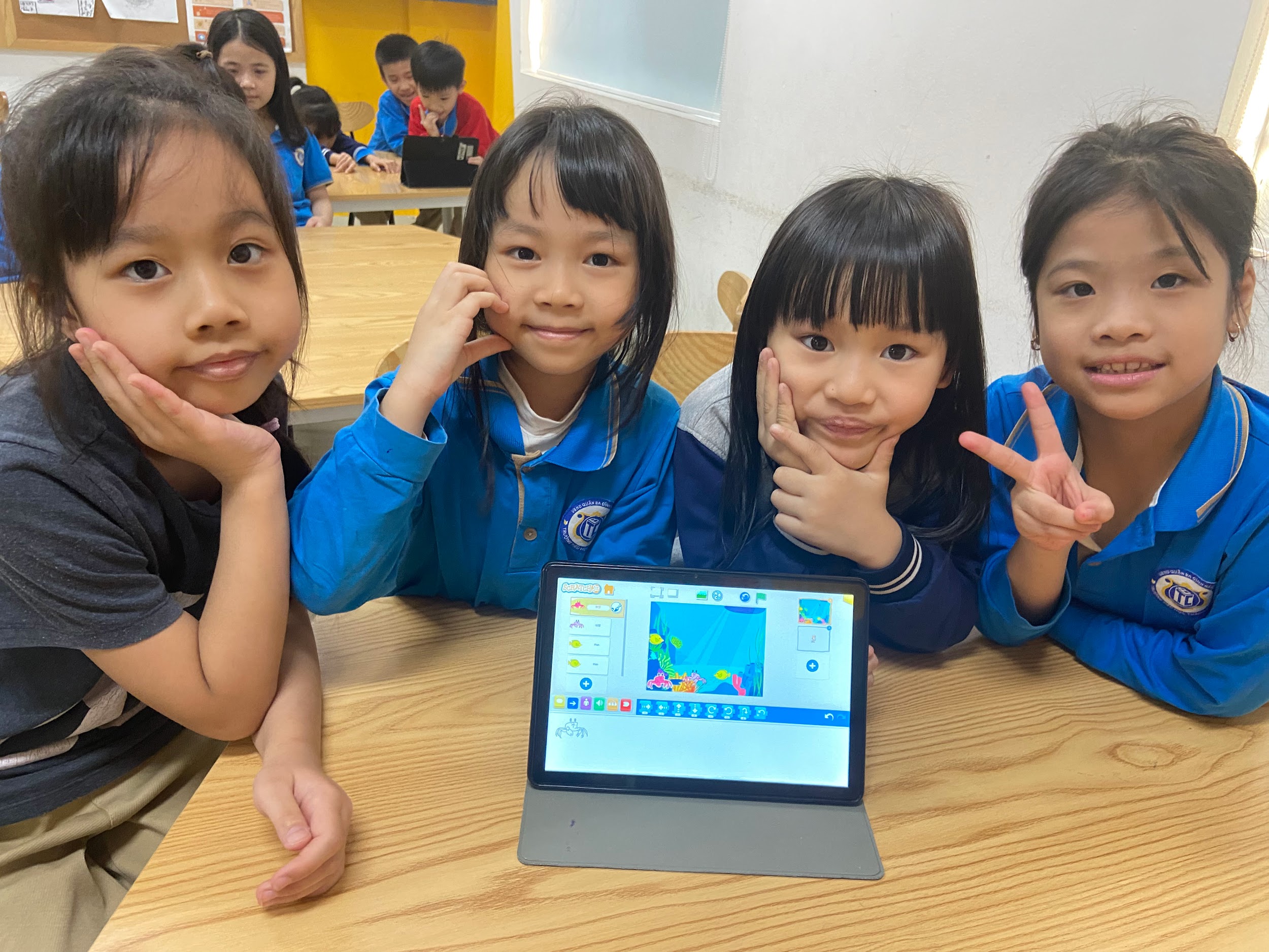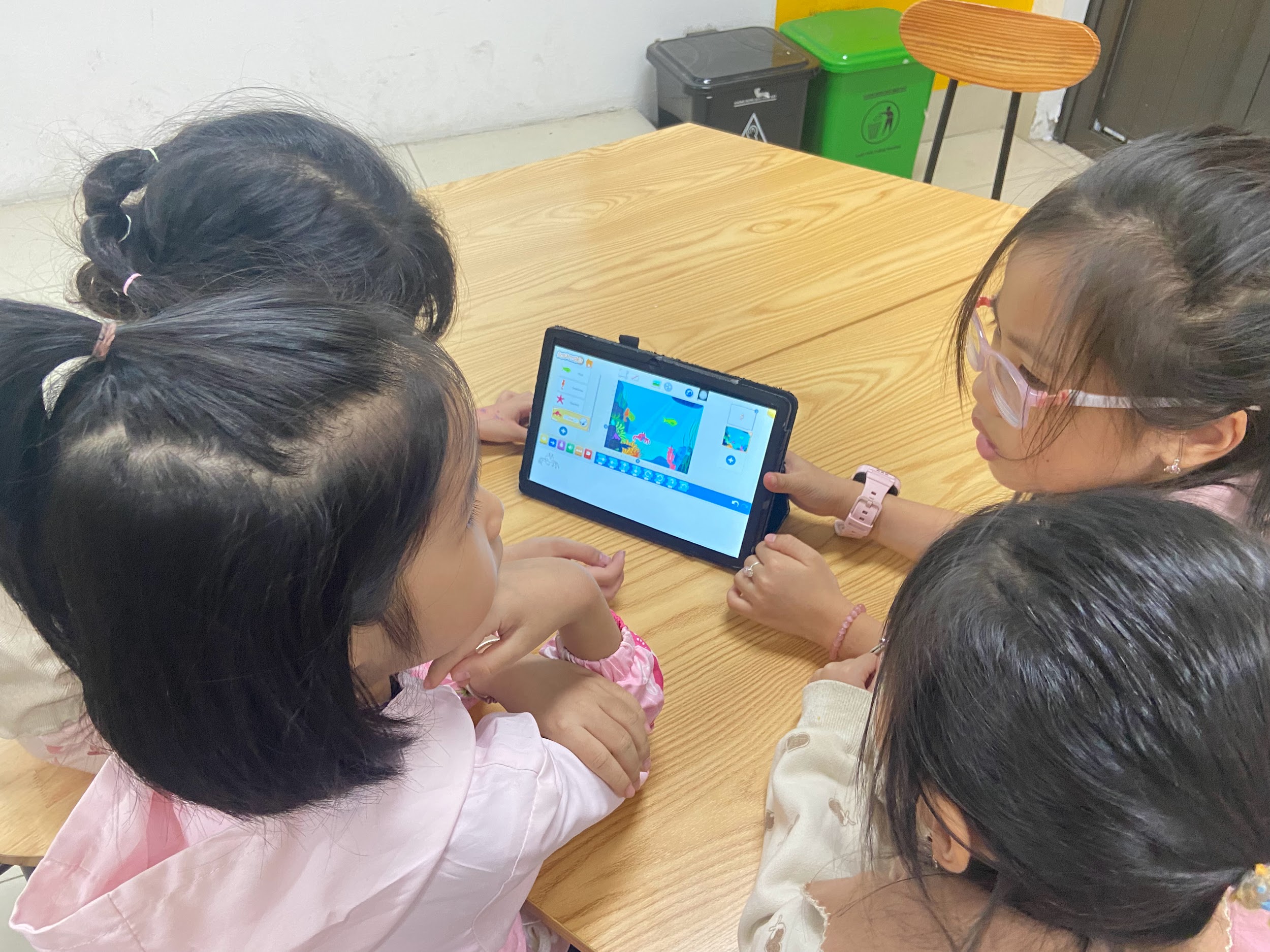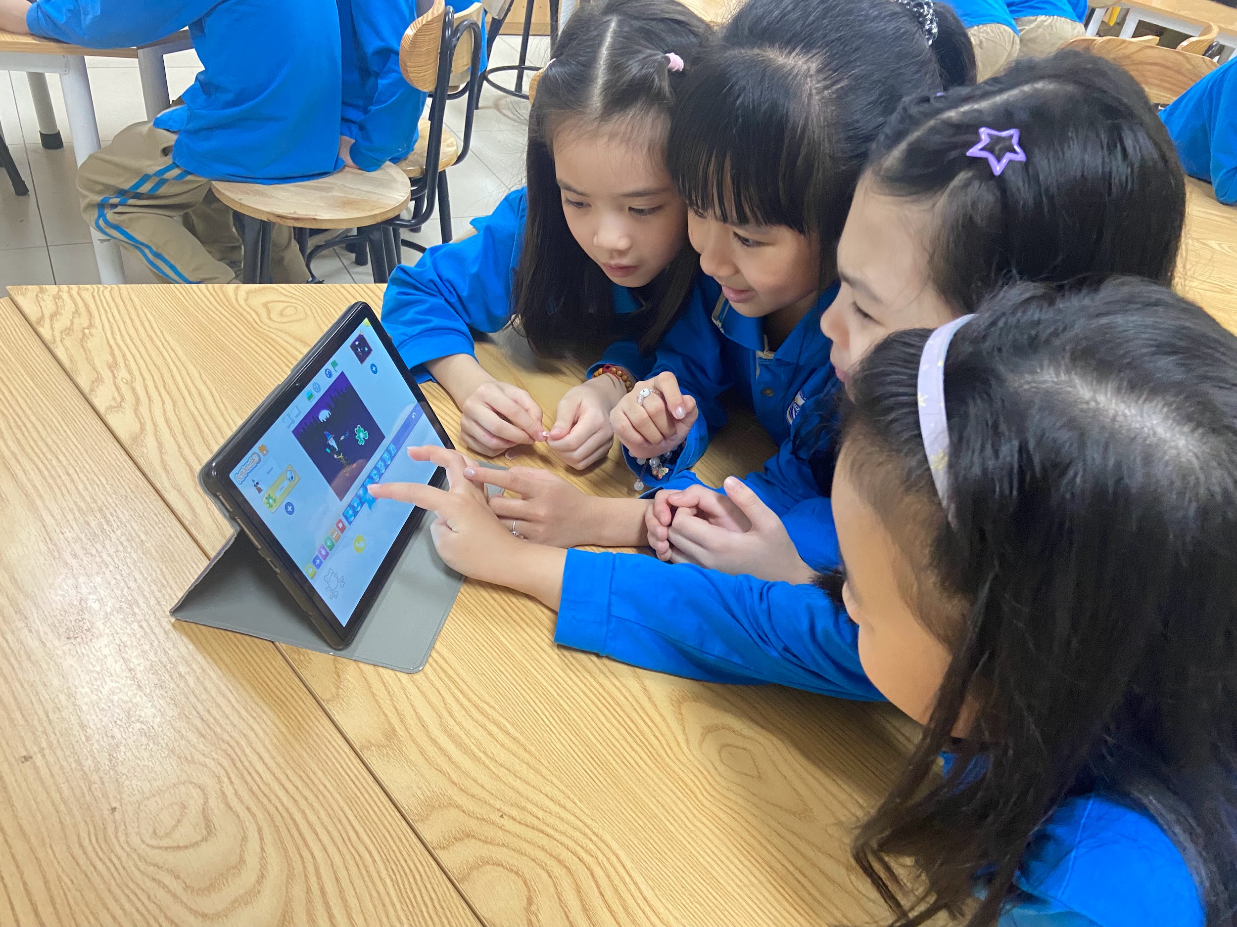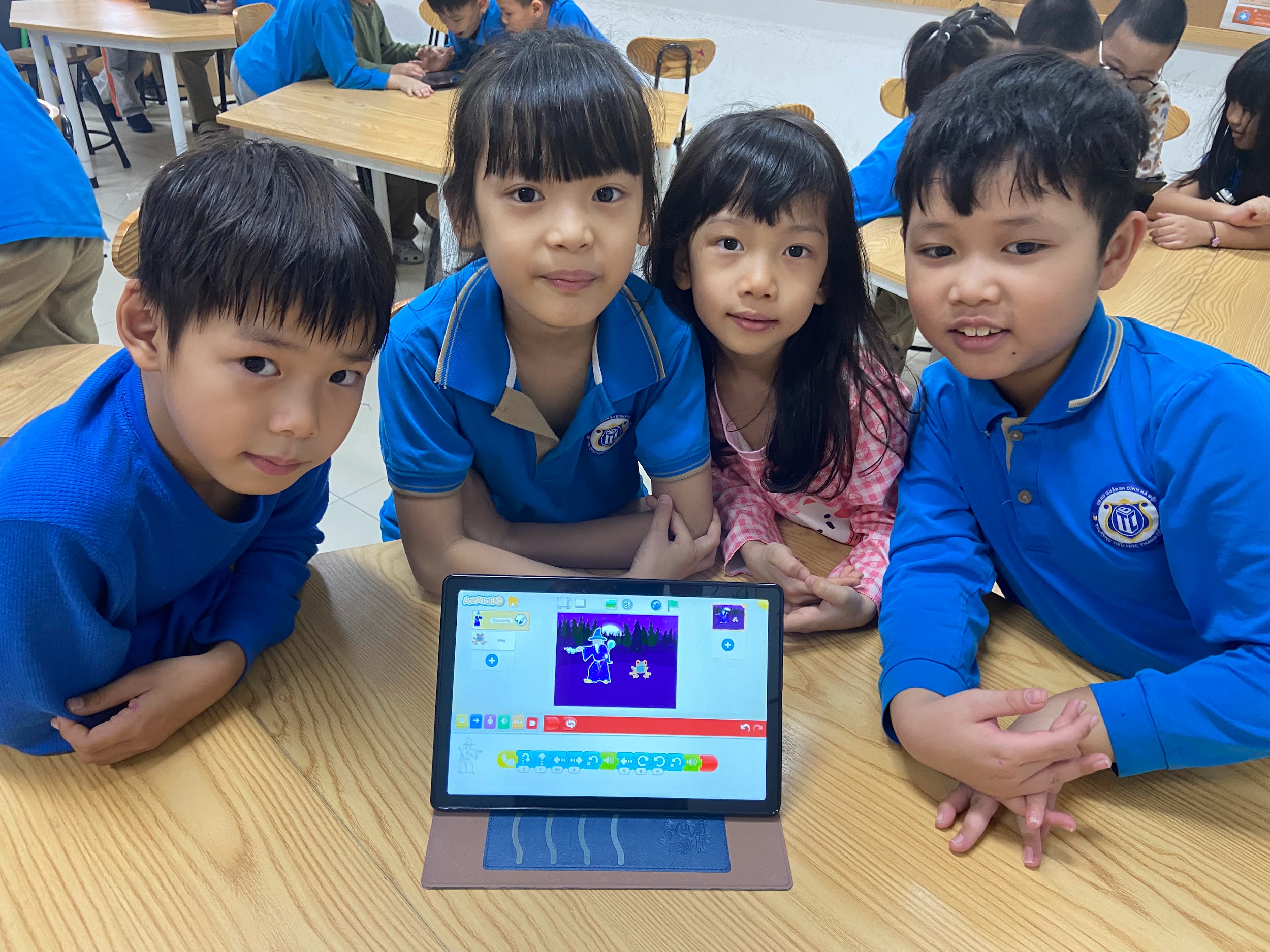 Trong học phần Lập trình với Scratch Junior, học sinh sử dụng máy tính bảng để kéo – thả các khối lệnh và tạo nên những câu chuyện sinh động của riêng mình. Các em học cách xây dựng bối cảnh, lập trình nhân vật di chuyển, thay đổi màu sắc, phát âm thanh và tương tác với nhau theo kịch bản tự sáng tạo.