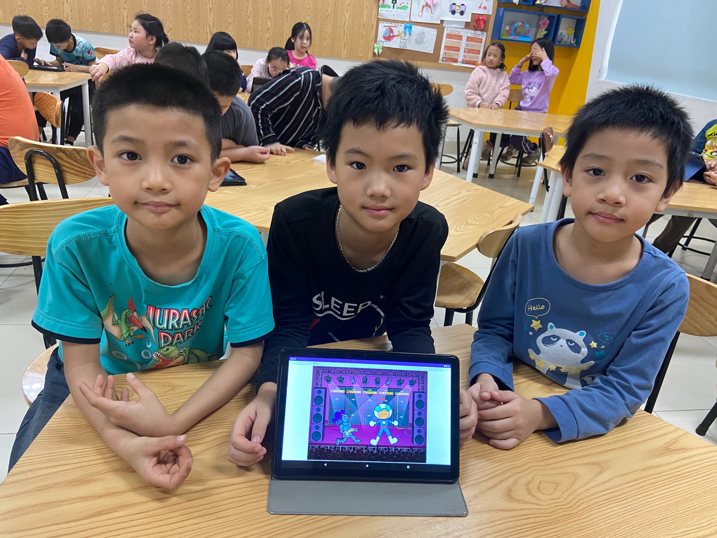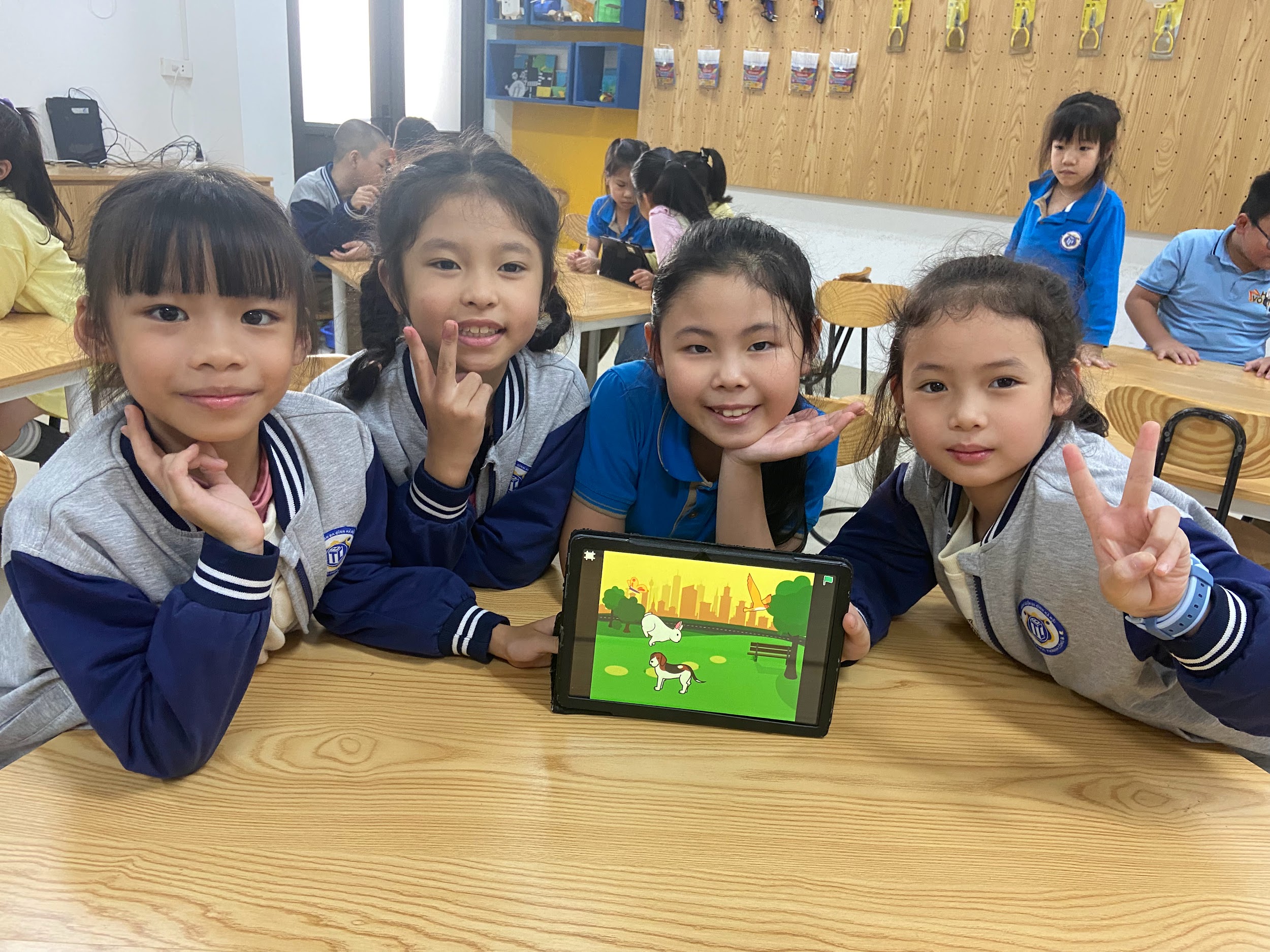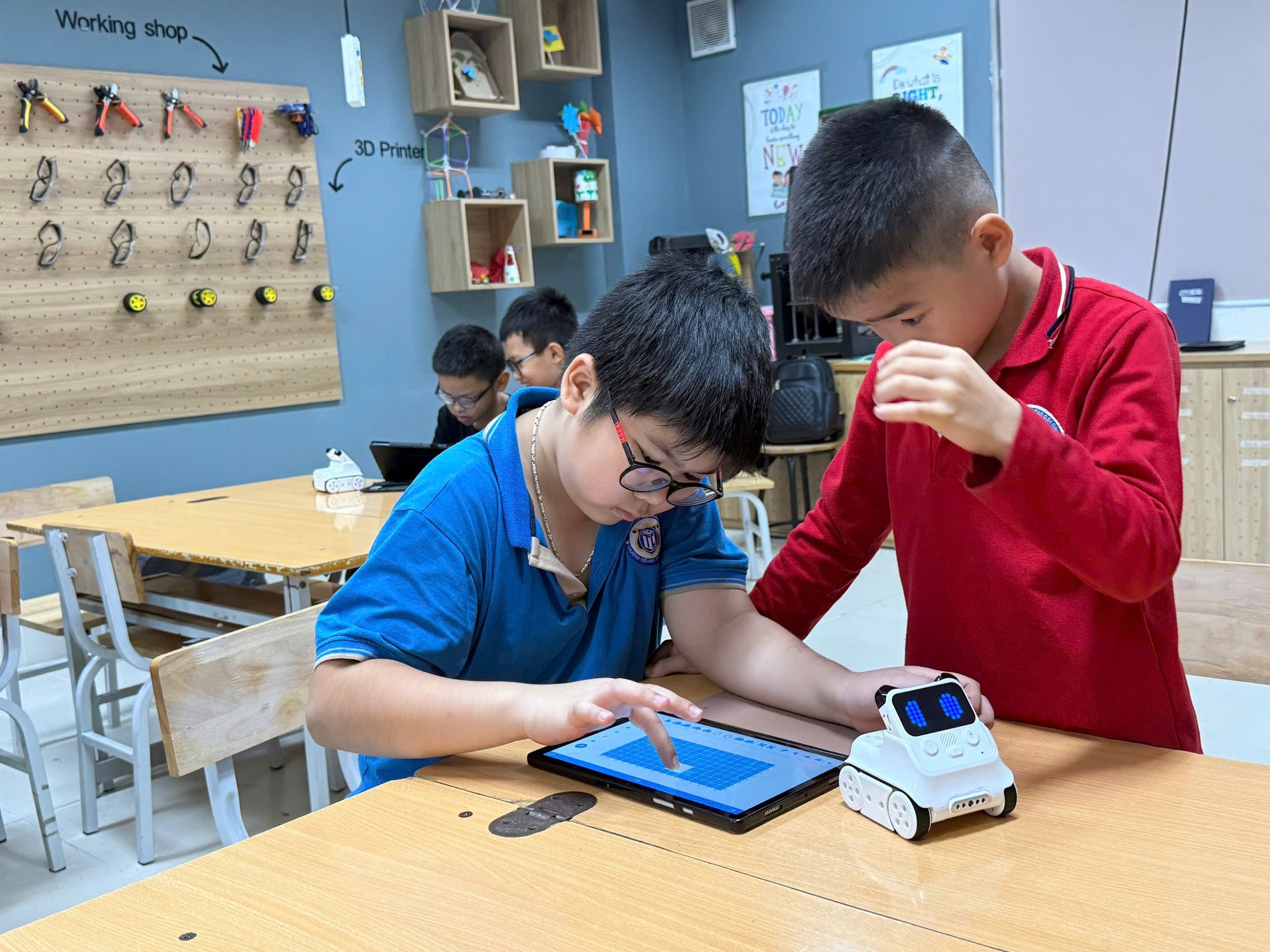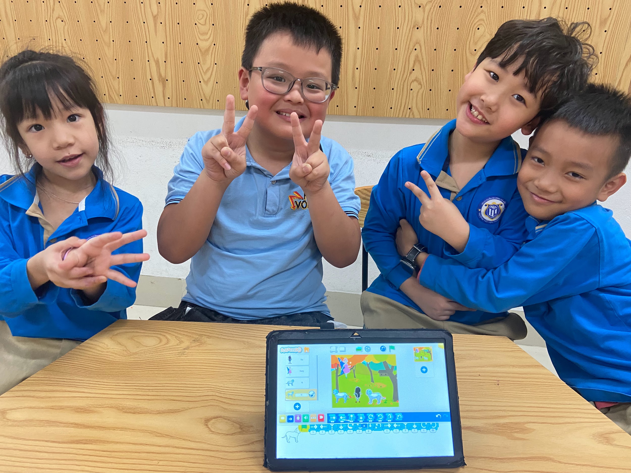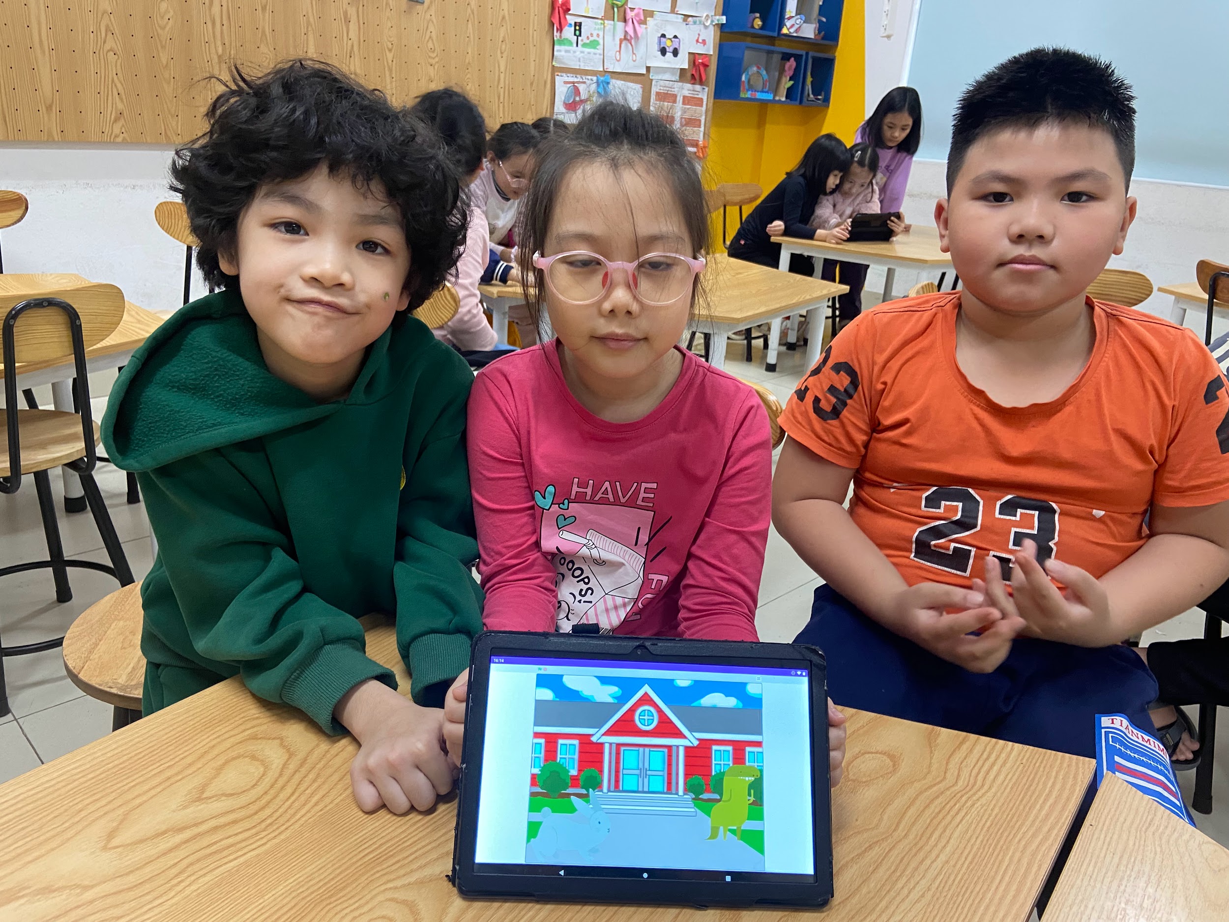 Trong học phần Lập trình với Scratch Junior, học sinh sử dụng máy tính bảng để kéo – thả các khối lệnh và tạo nên những câu chuyện sinh động của riêng mình. Các em học cách xây dựng bối cảnh, lập trình nhân vật di chuyển, thay đổi màu sắc, phát âm thanh và tương tác với nhau theo kịch bản tự sáng tạo.