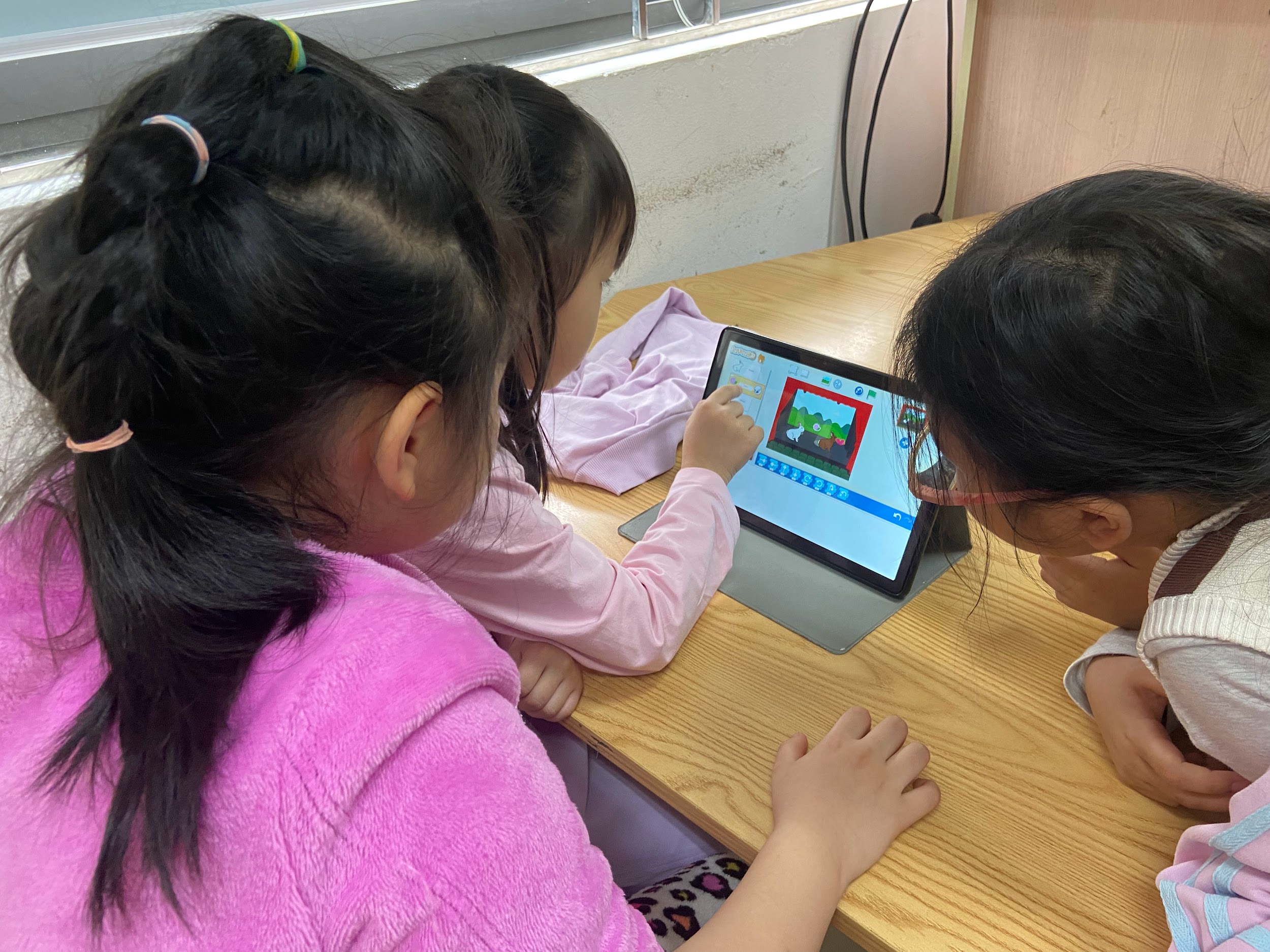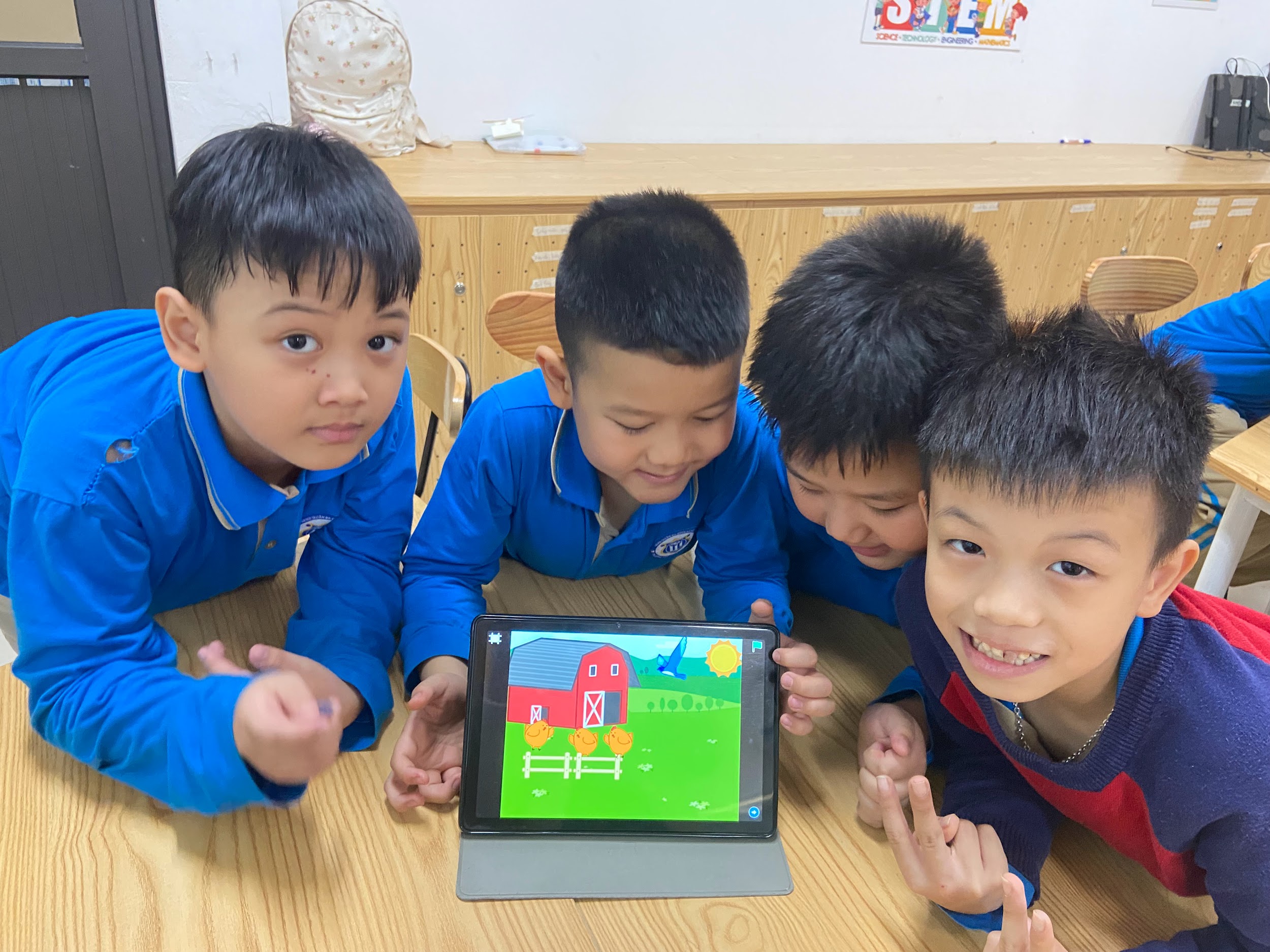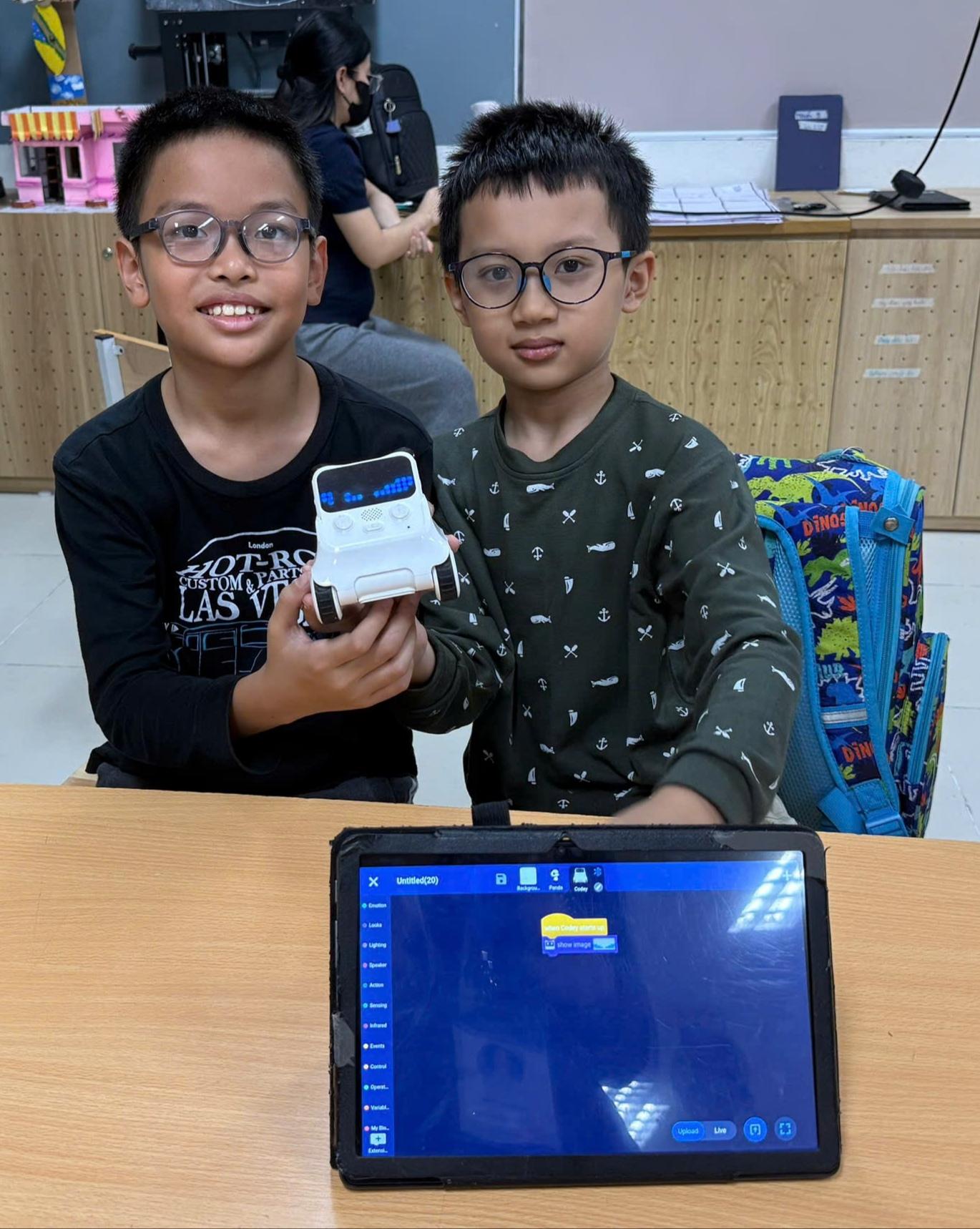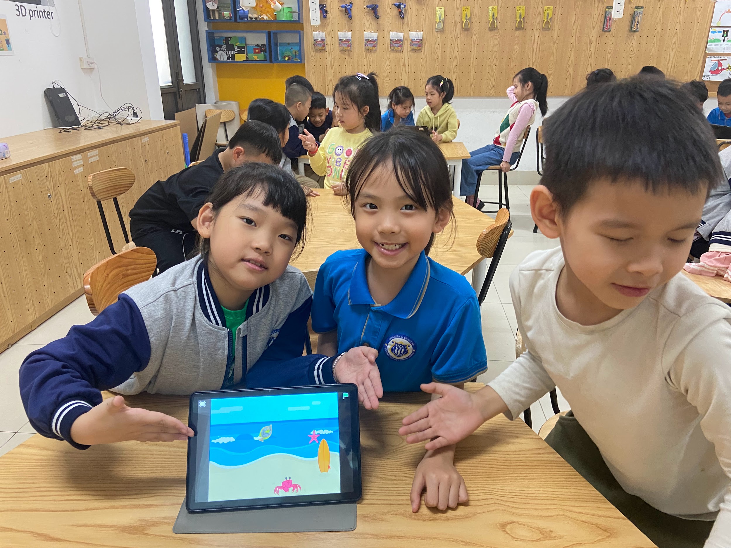 Trong học phần Lập trình với Scratch Junior, học sinh sử dụng máy tính bảng để kéo – thả các khối lệnh và tạo nên những câu chuyện sinh động của riêng mình. Các em học cách xây dựng bối cảnh, lập trình nhân vật di chuyển, thay đổi màu sắc, phát âm thanh và tương tác với nhau theo kịch bản tự sáng tạo.