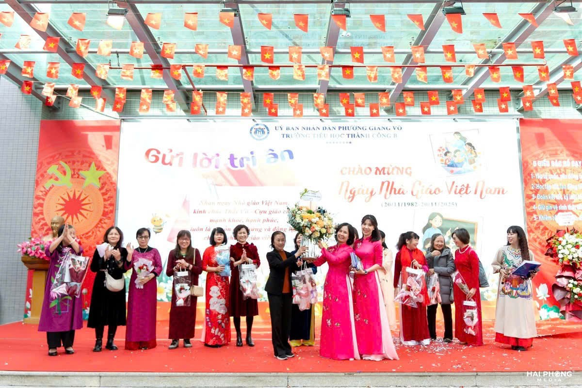 Từng khoảnh khắc trong buổi lễ đều đong đầy cảm xúc: từ ánh mắt rạng rỡ của các thầy cô nhận bằng khen, niềm hạnh phúc của cựu giáo viên trở về mái trường xưa, cho đến niềm vui hồn nhiên của học sinh khi chứng kiến thầy cô biểu diễn tiết mục văn nghệ đặc sắc. Lẵng hoa tươi thắm từ các đại biểu, cựu giáo viên và chính Ban giám hiệu đã trở thành biểu tượng của tình cảm, sự trân trọng dành cho nghề giáo.