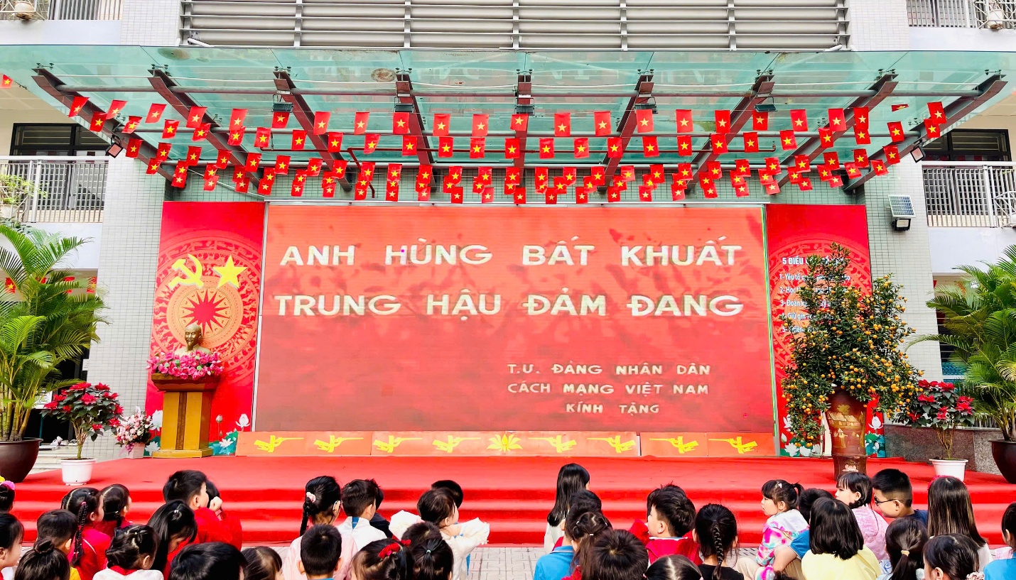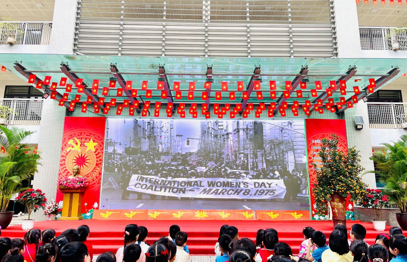 Ngay từ sớm, sân trường đã trở nên rực rỡ với sắc hoa và những thông điệp yêu thương, tạo nên không gian ấm áp và tràn đầy cảm xúc của tuần lễ chào mừng ngày 8 – 3