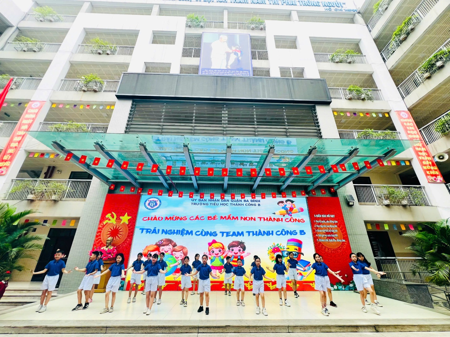 Các anh chị học sinh trường Tiểu học Thành Công B đã nồng nhiệt chào đón các bé đến thăm trường với các tiết mục văn nghệ sôi nổi giao lưu giữa hai trường.